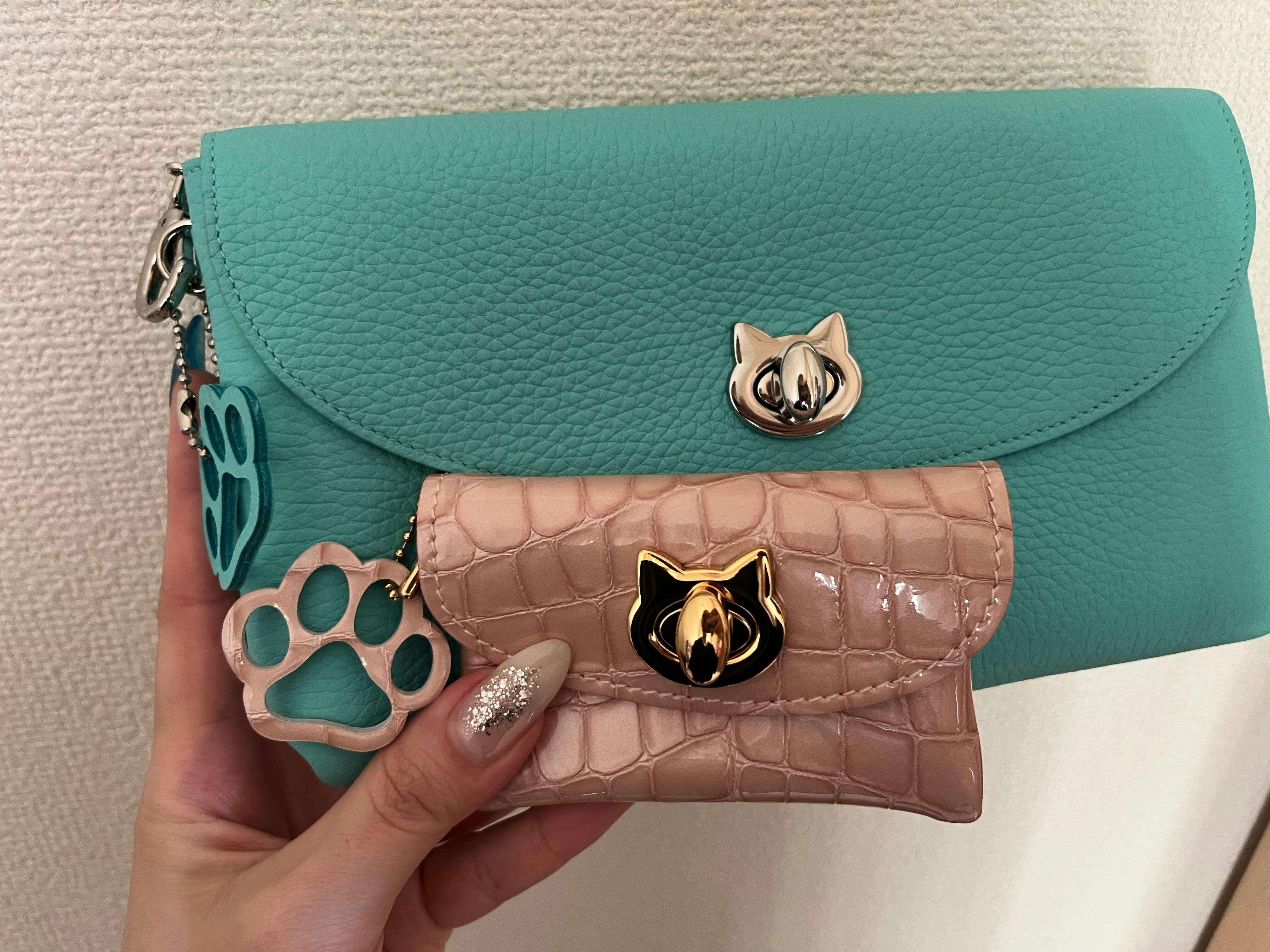 This pouch has a simple form and is decorated with cat metal fittings and paw charms, making it perfect for cat lovers.