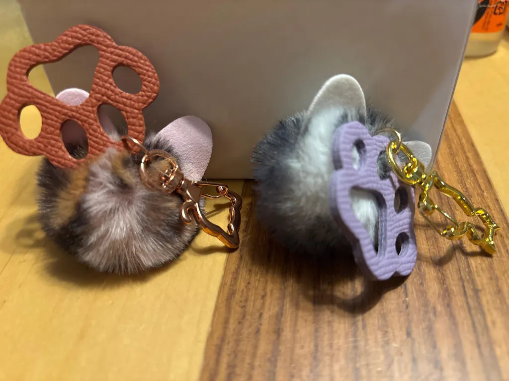A keychain with cat-shaped fur and paw prints overlapping, like a capsule toy.