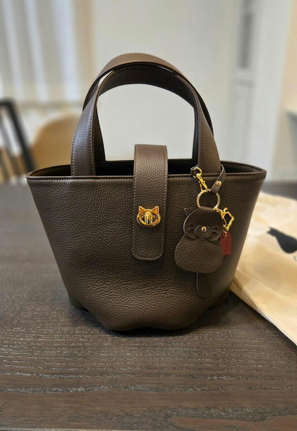底に最大のねこポイントが隠された、シンプルなバケツ型ハンドバッグ。