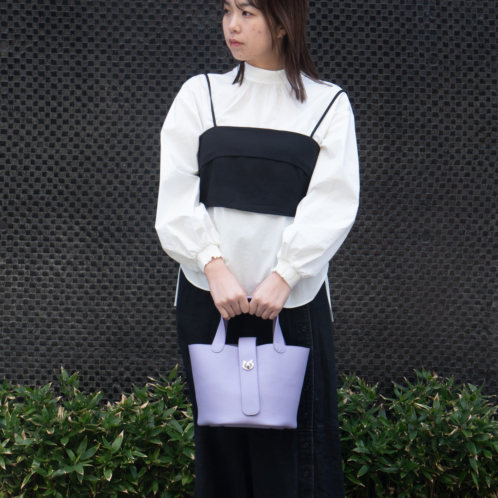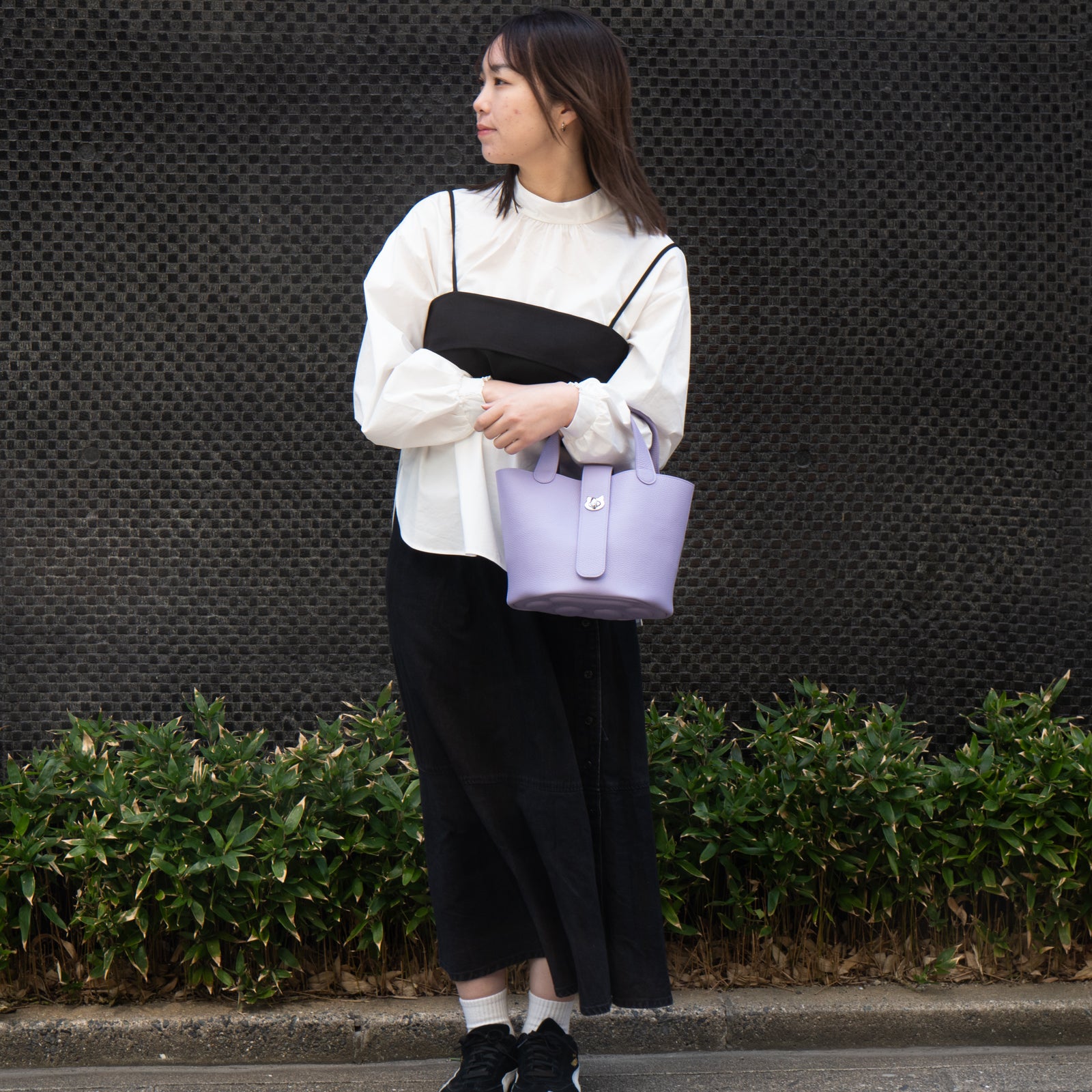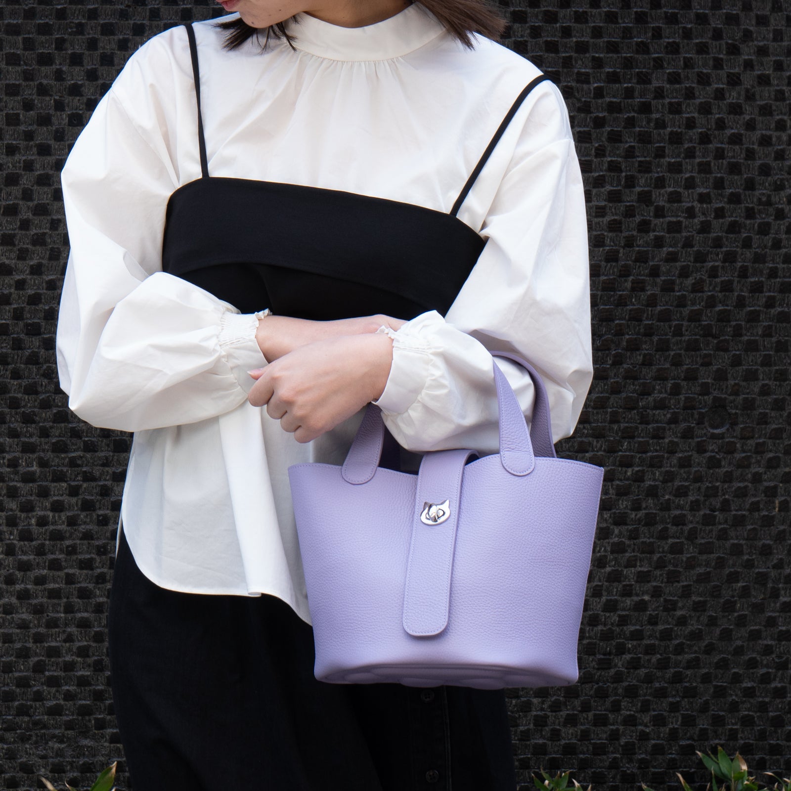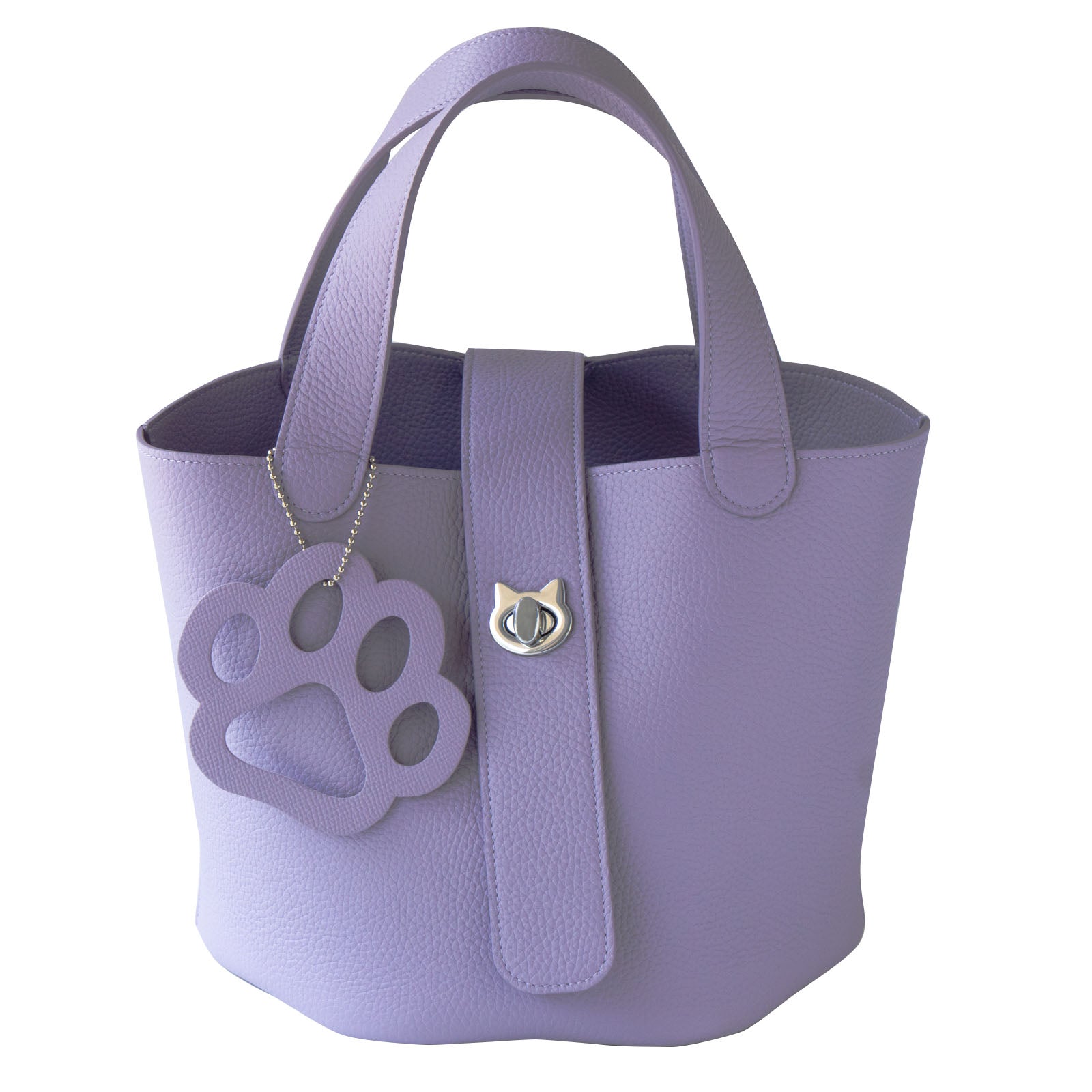 底に最大のねこポイントが隠された、シンプルなバケツ型ハンドバッグ。