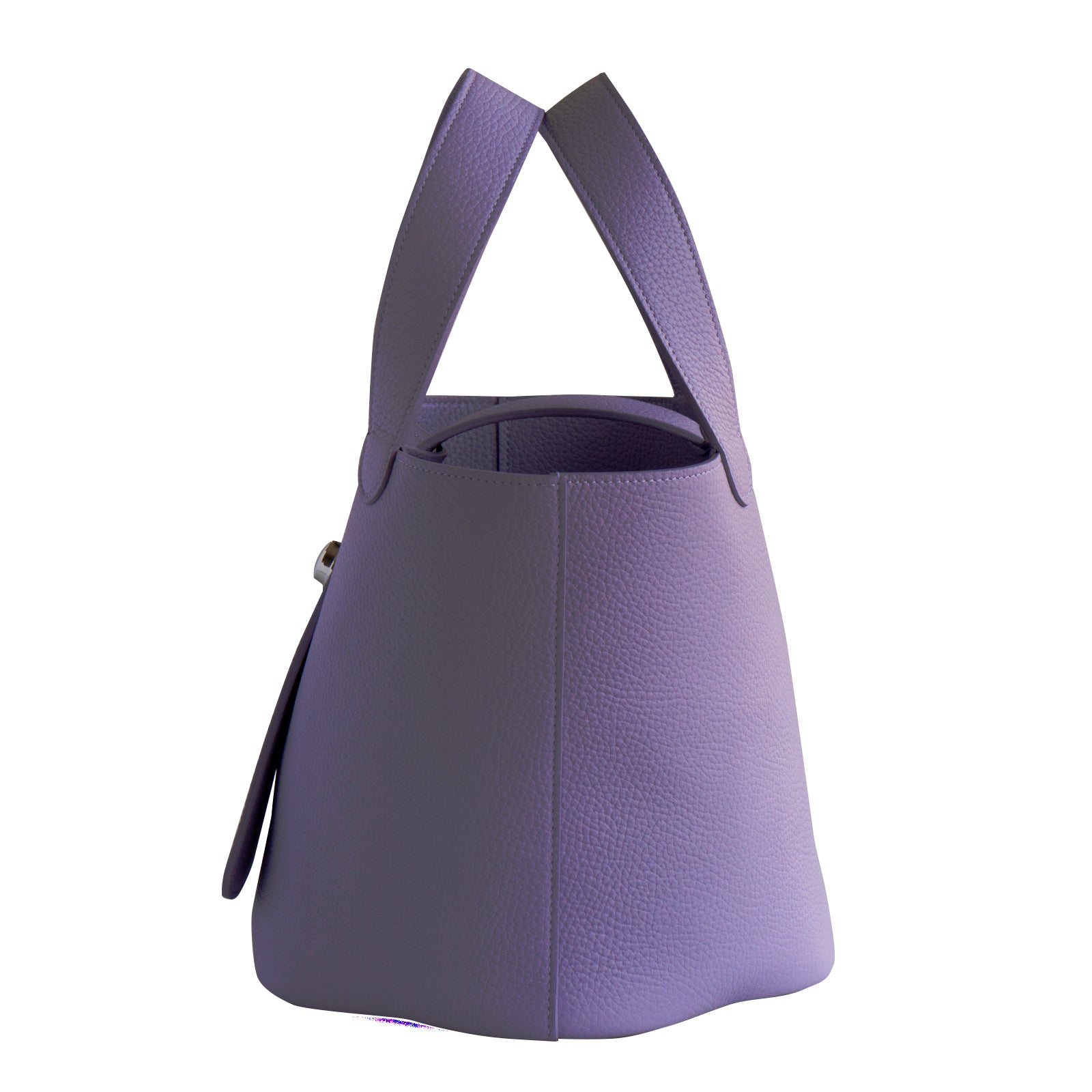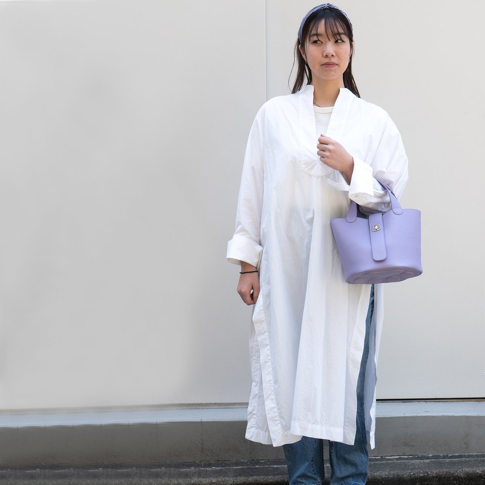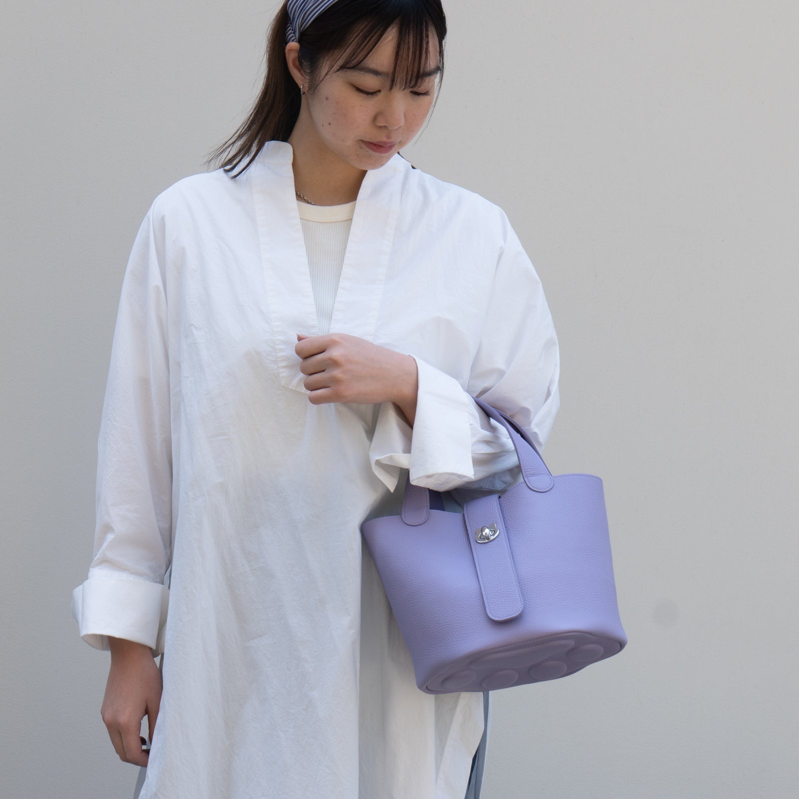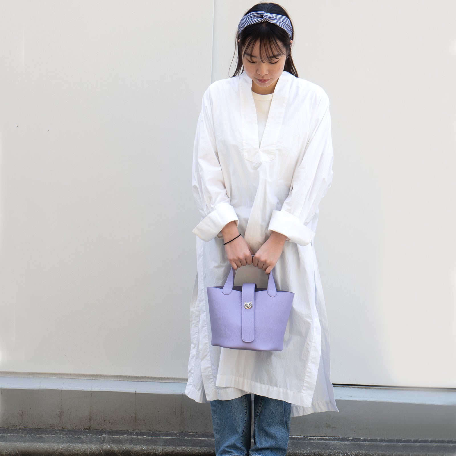 底に最大のねこポイントが隠された、シンプルなバケツ型ハンドバッグ。