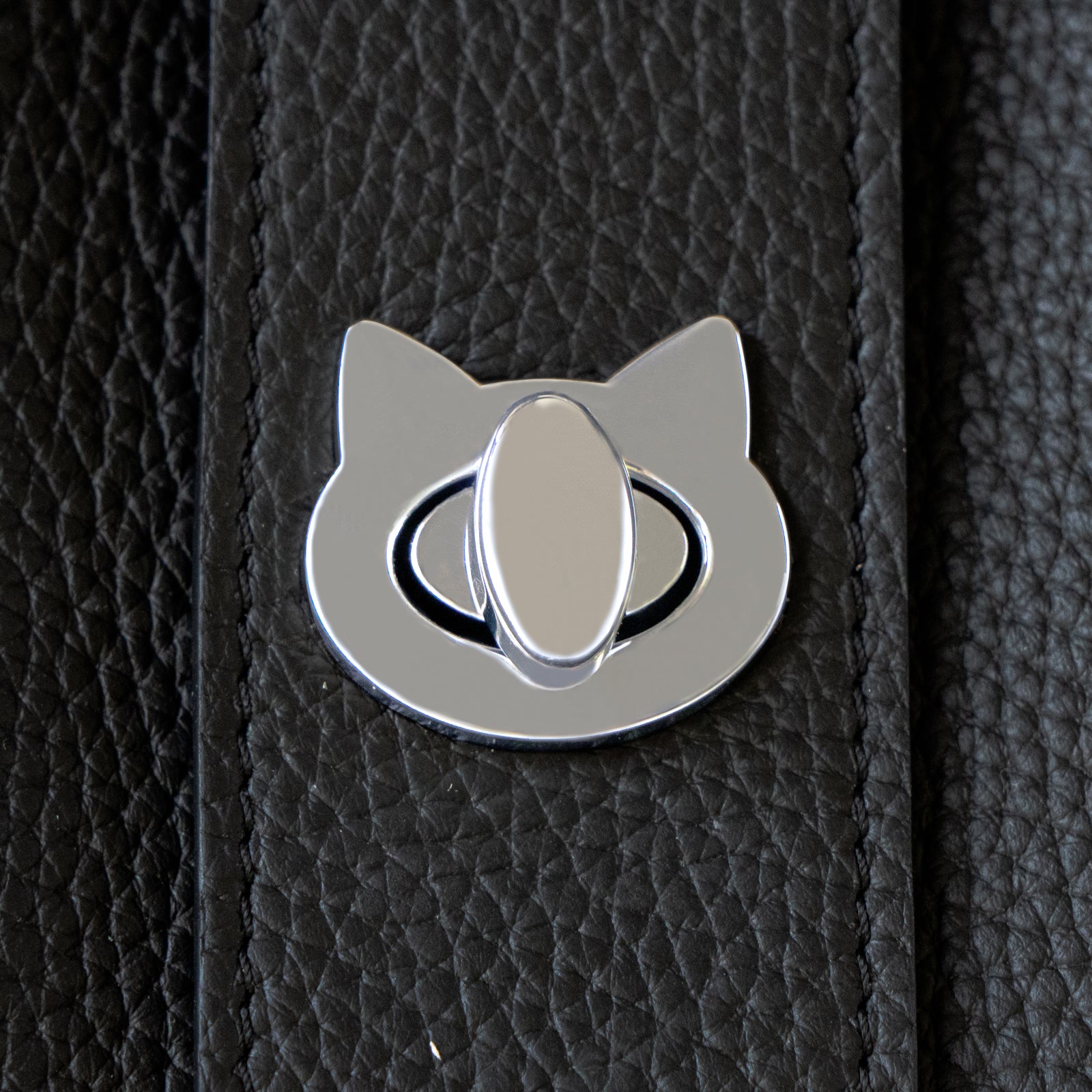 開口部のベルトをとめる部分にねこのひねり金具が光ります。