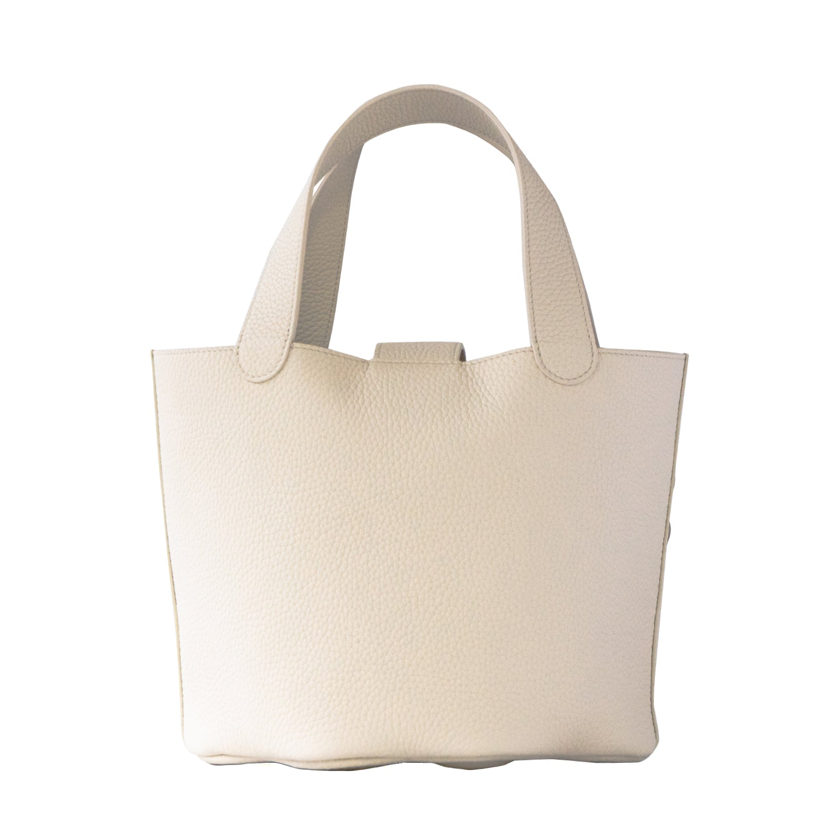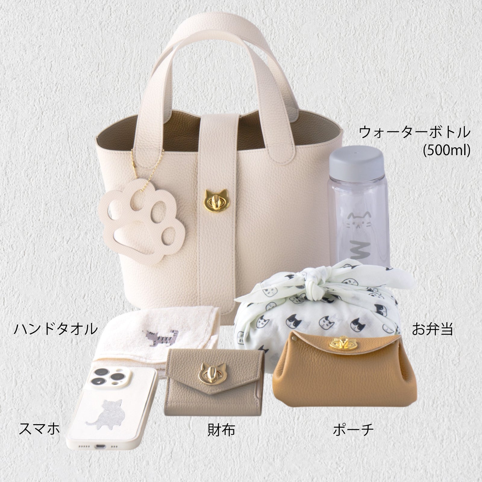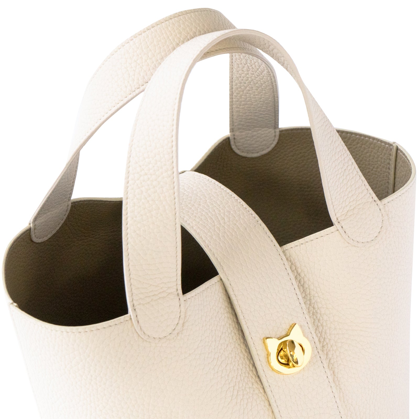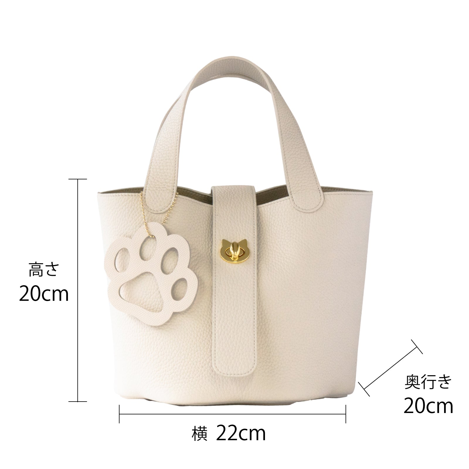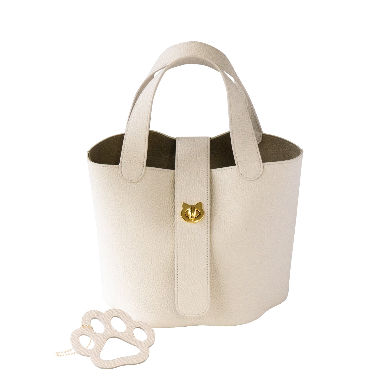 底に最大のねこポイントが隠された、シンプルなバケツ型ハンドバッグ。