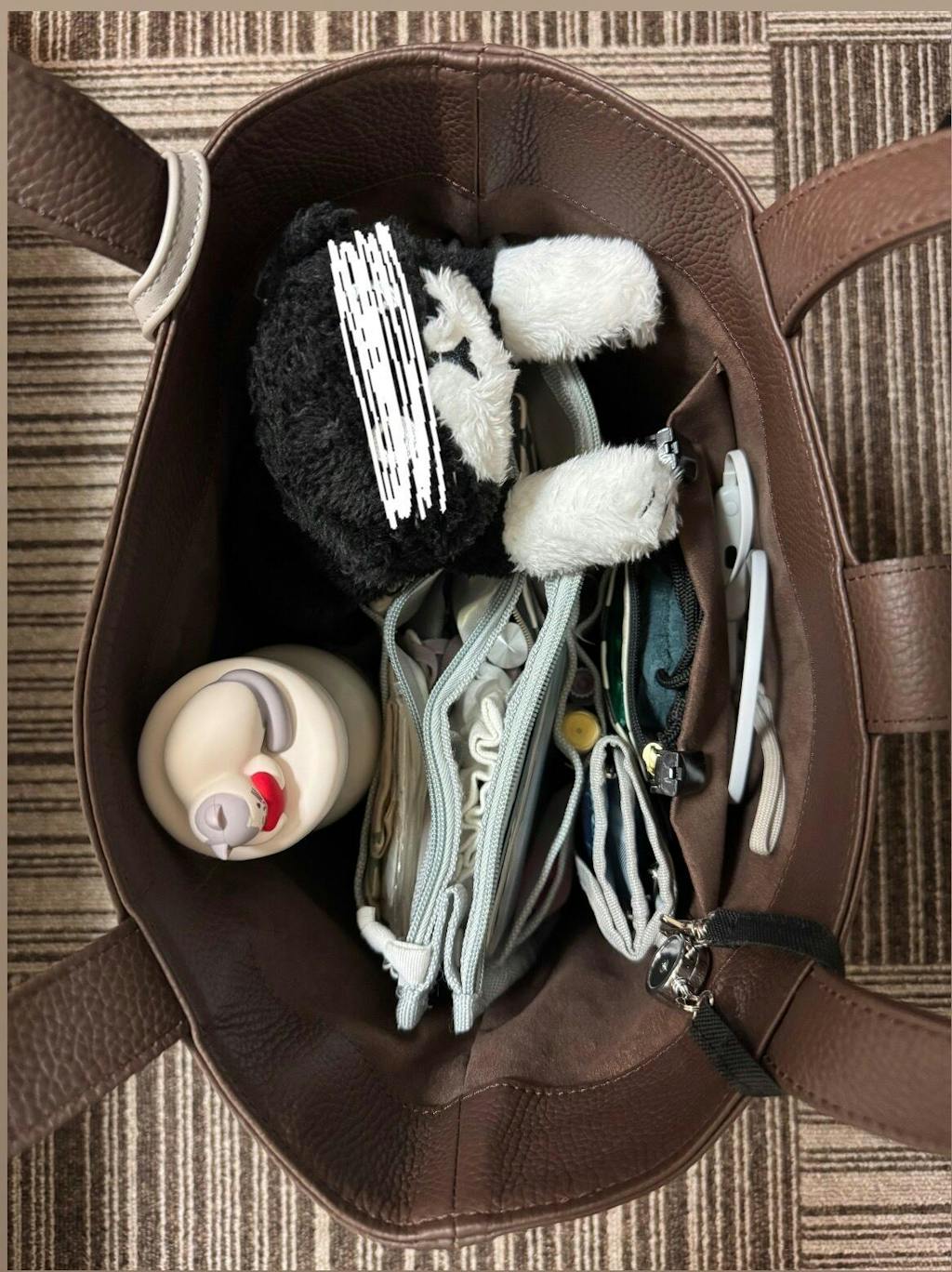 長財布やスマホなどの必需品はもちろん、ポーチは2つほど、500mlのペットボトルや折りたたみ傘、手帳やiPadまで入れても、まだゆとりのある超大容量!