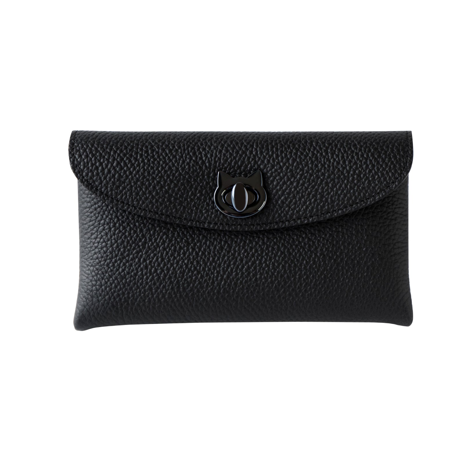 ラウンドしたフラップにねこの顔型金具が光ります。