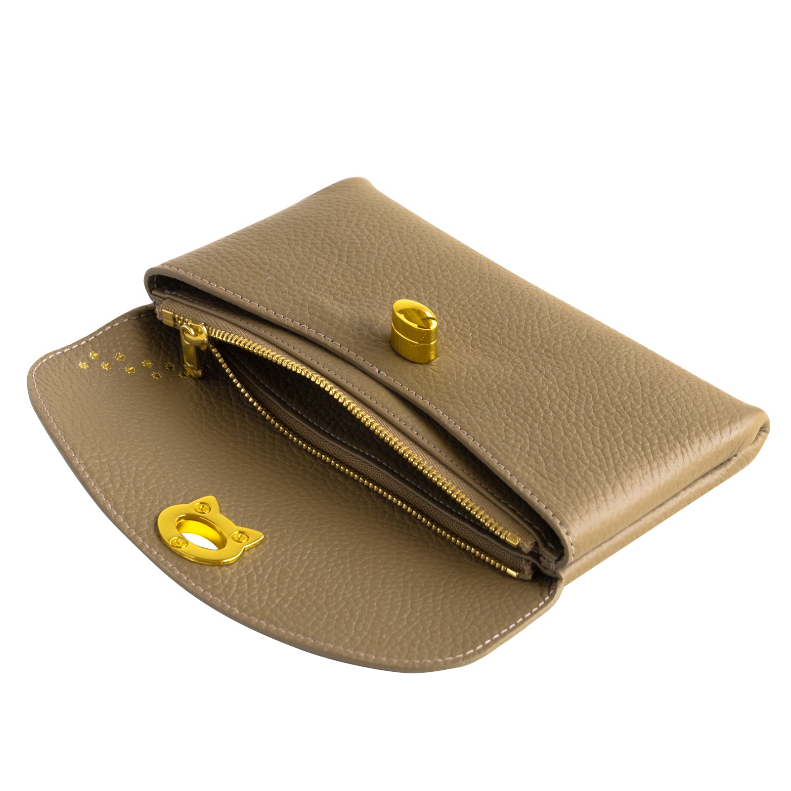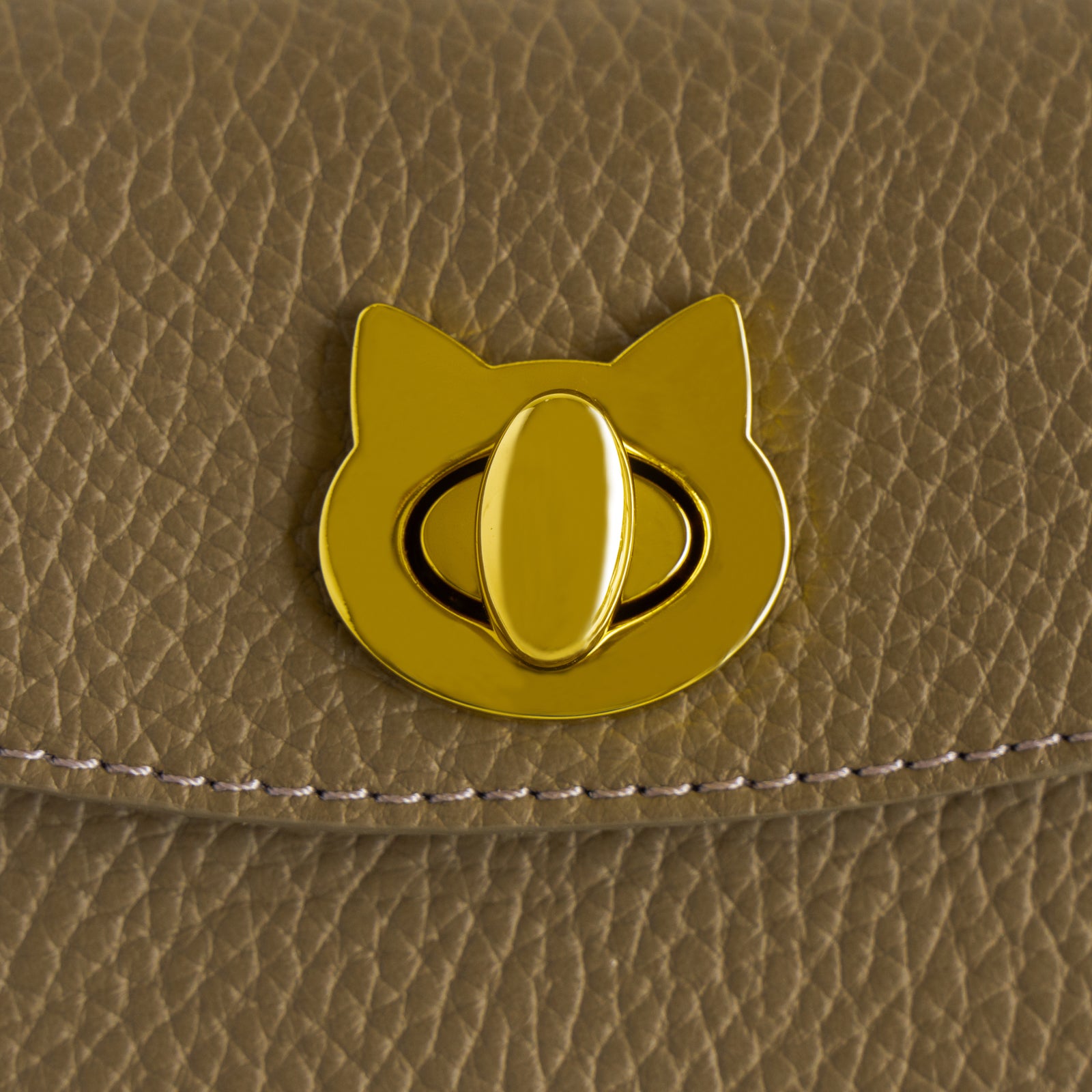 ラウンドしたフラップにねこの顔型金具が光ります。
