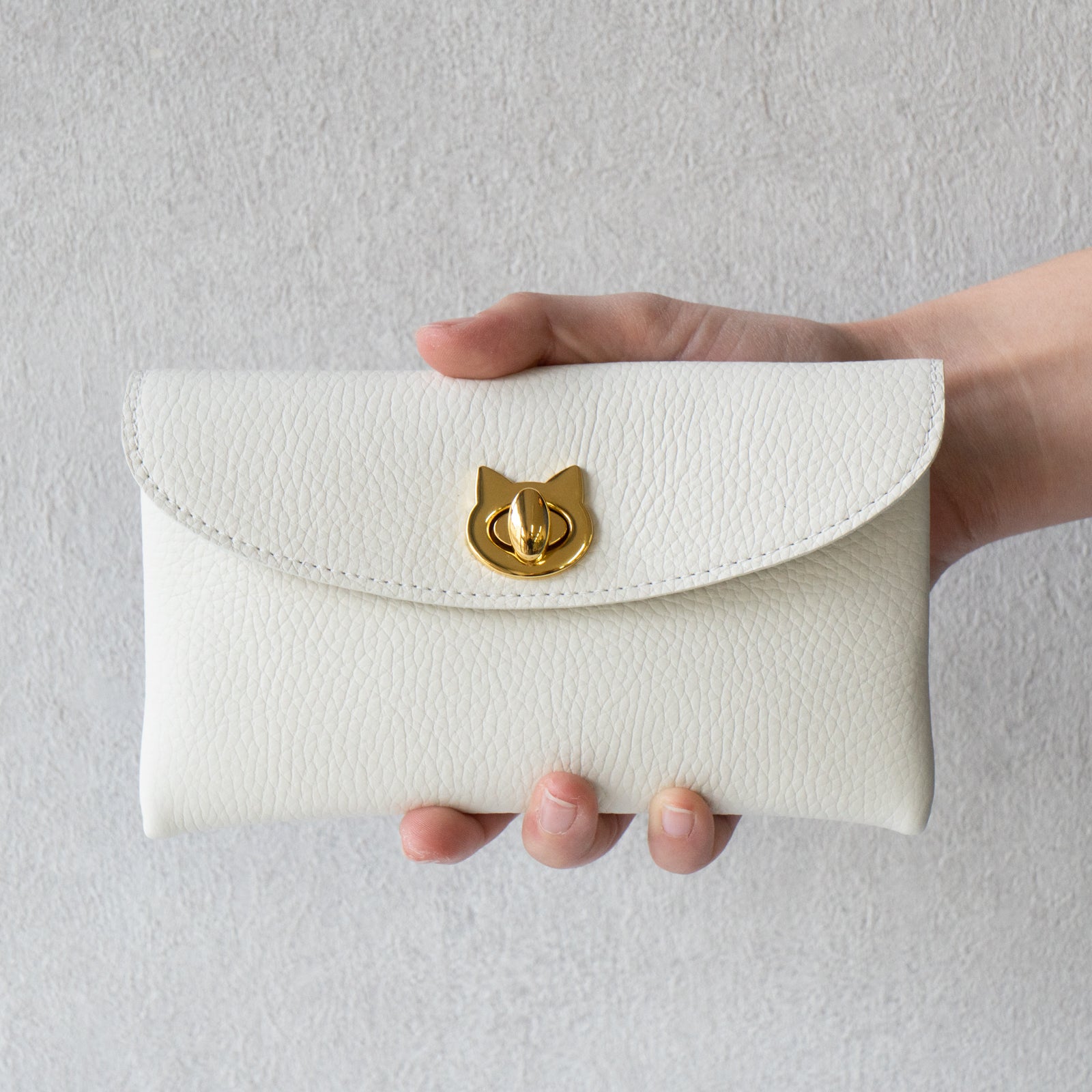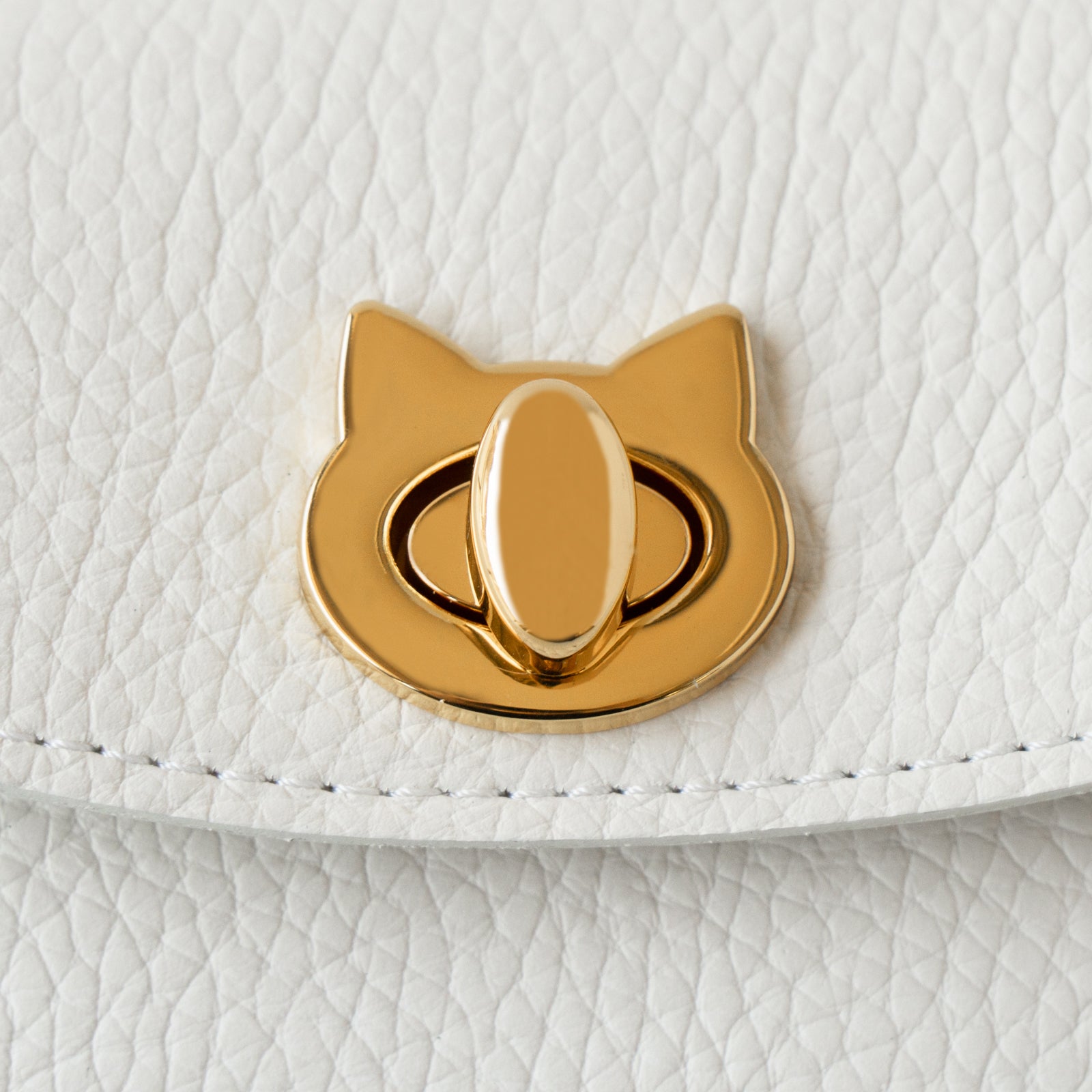 ラウンドしたフラップにねこの顔型金具が光ります。
