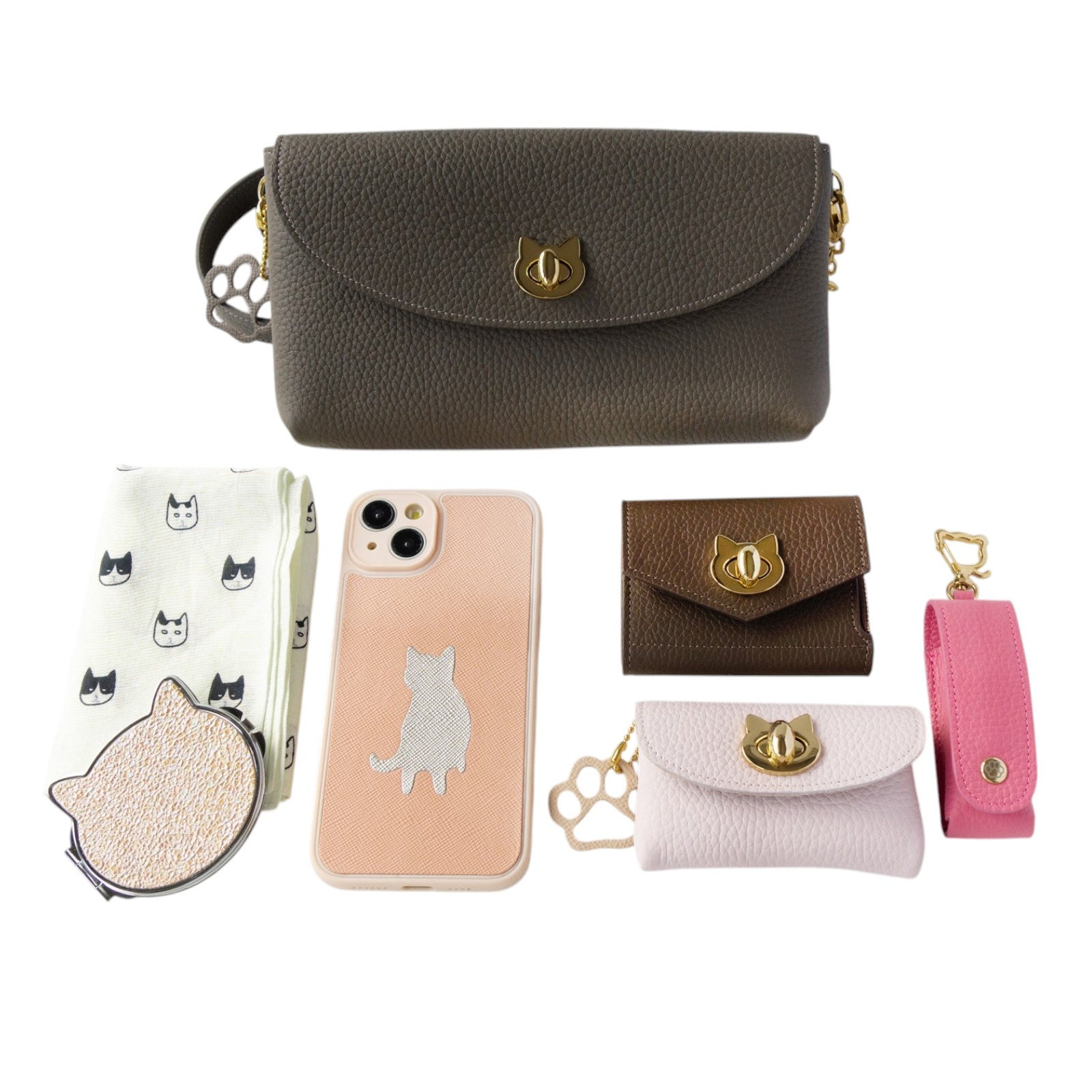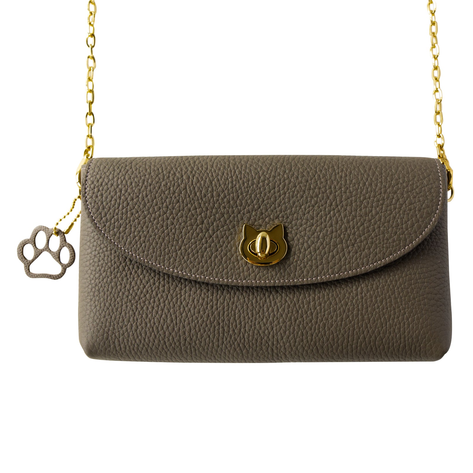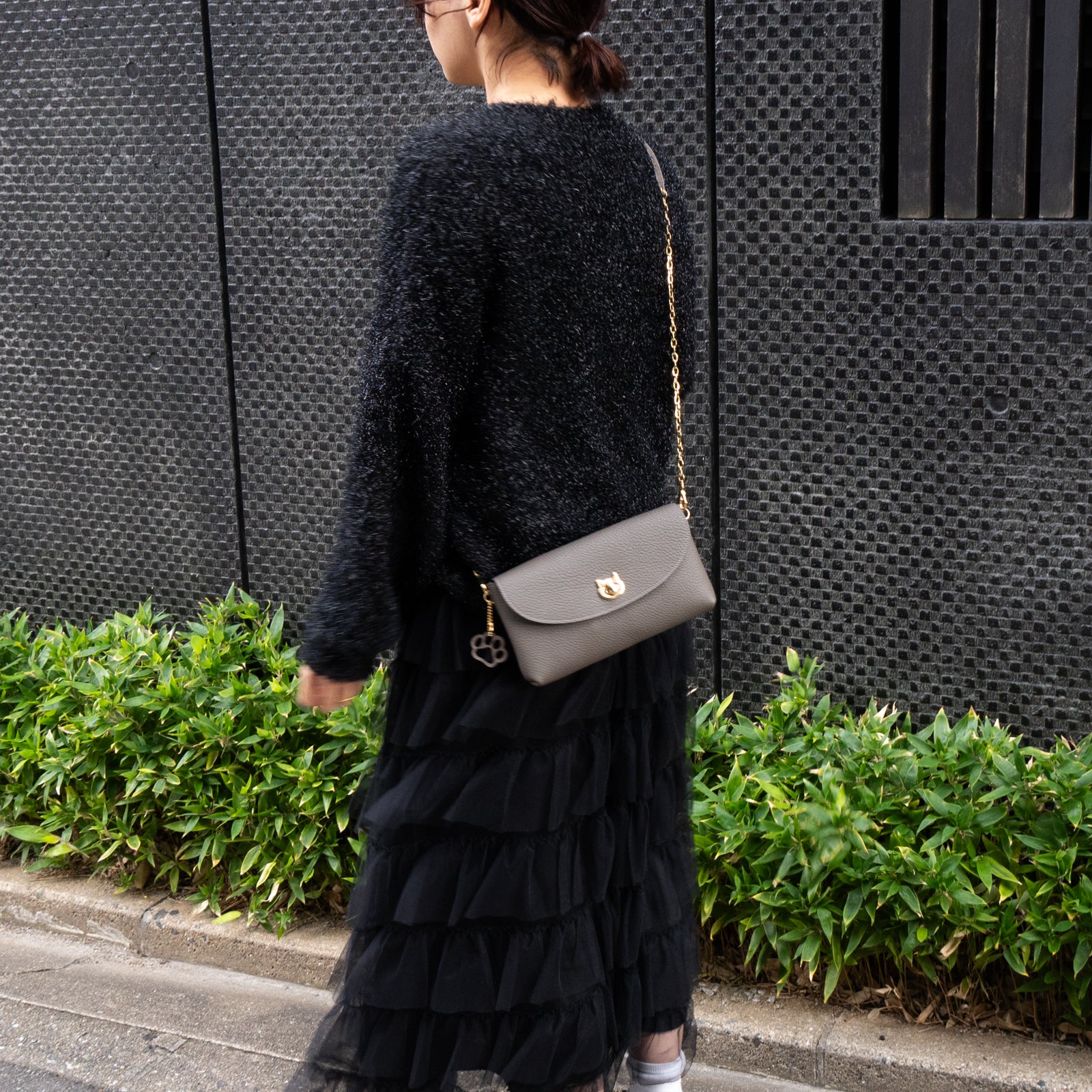 シンプルなフォルムにねこ金具と肉球チャームがマッチした、ねこ好きさんにぴったりのポシェットです。
