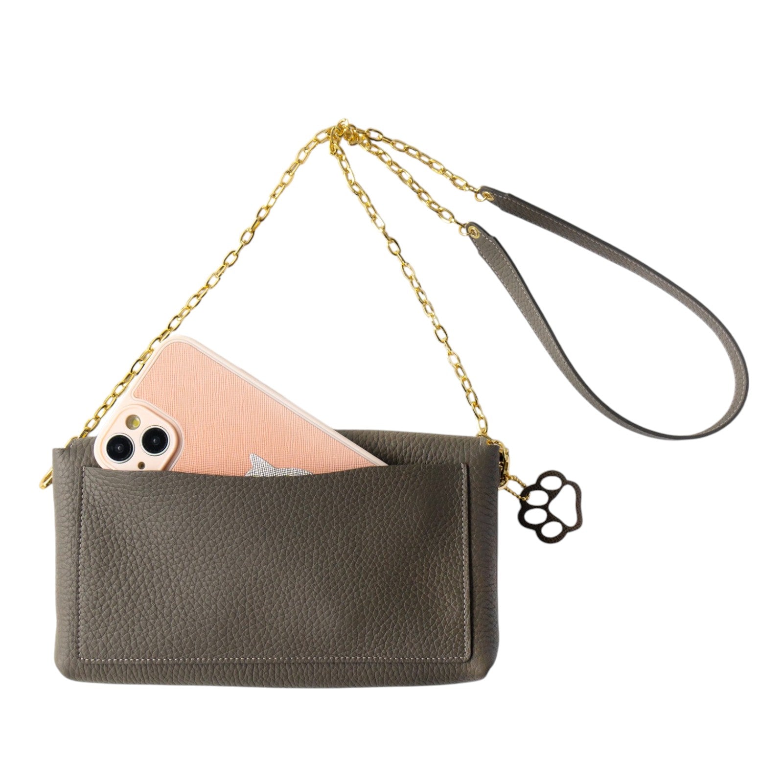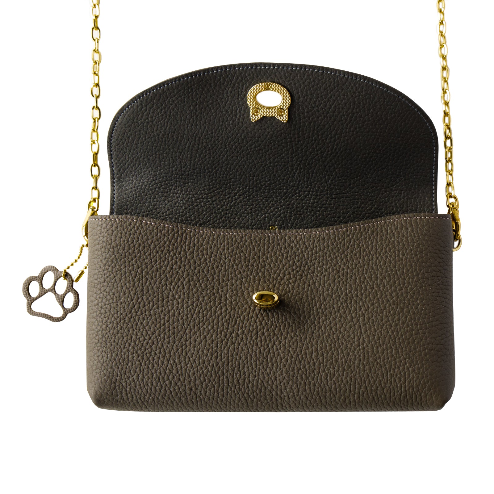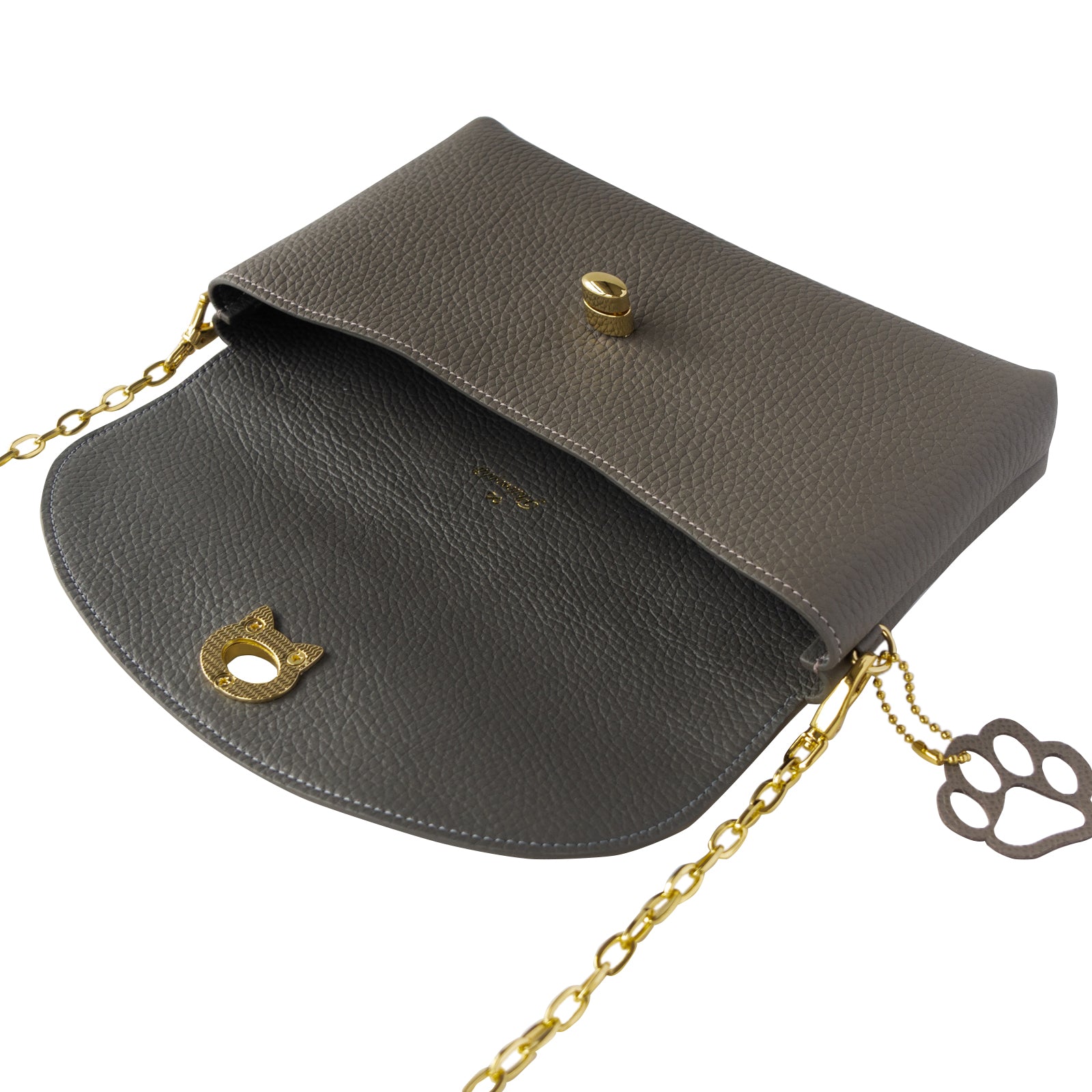 シンプルなフォルムにねこ金具と肉球チャームがマッチした、ねこ好きさんにぴったりのポシェットです。
