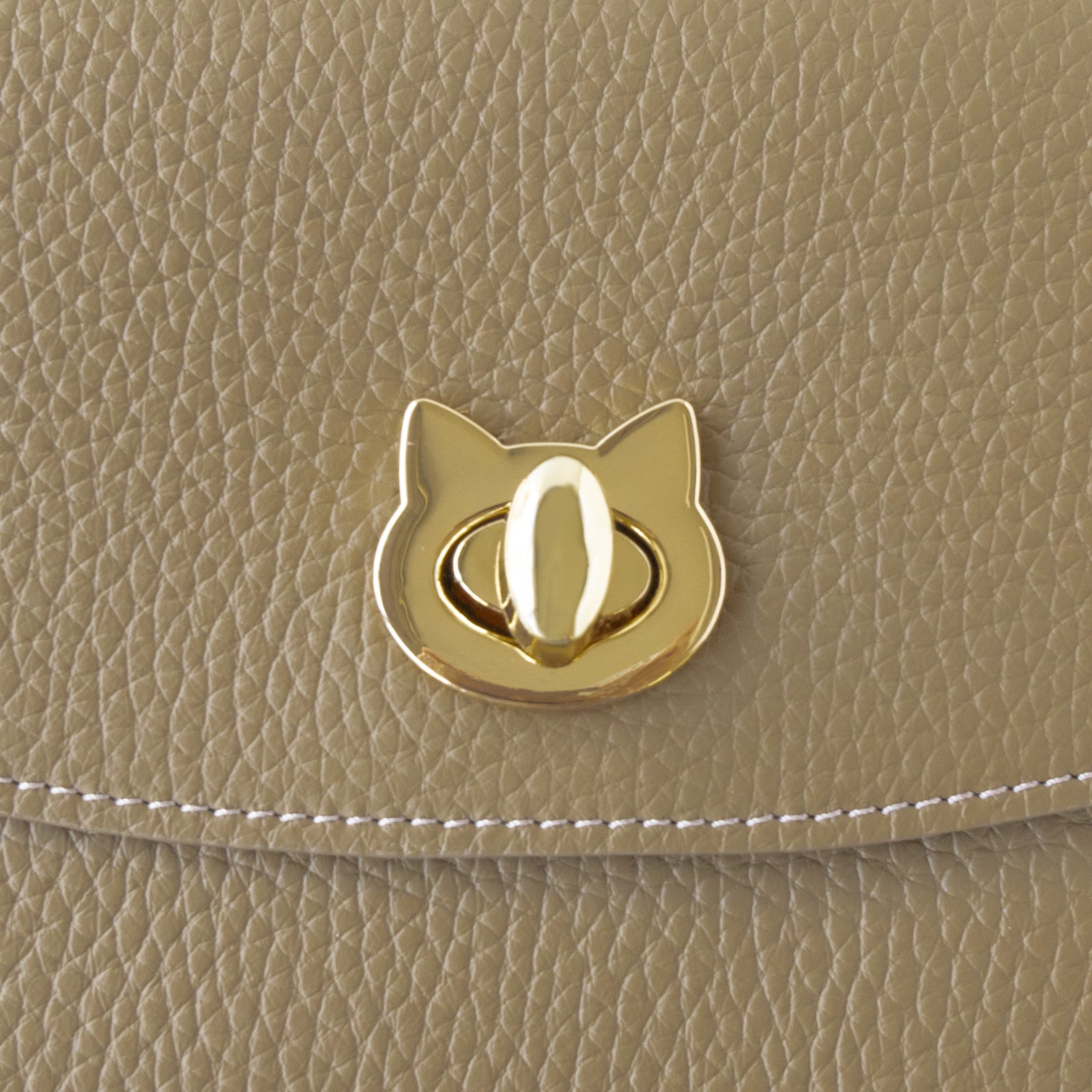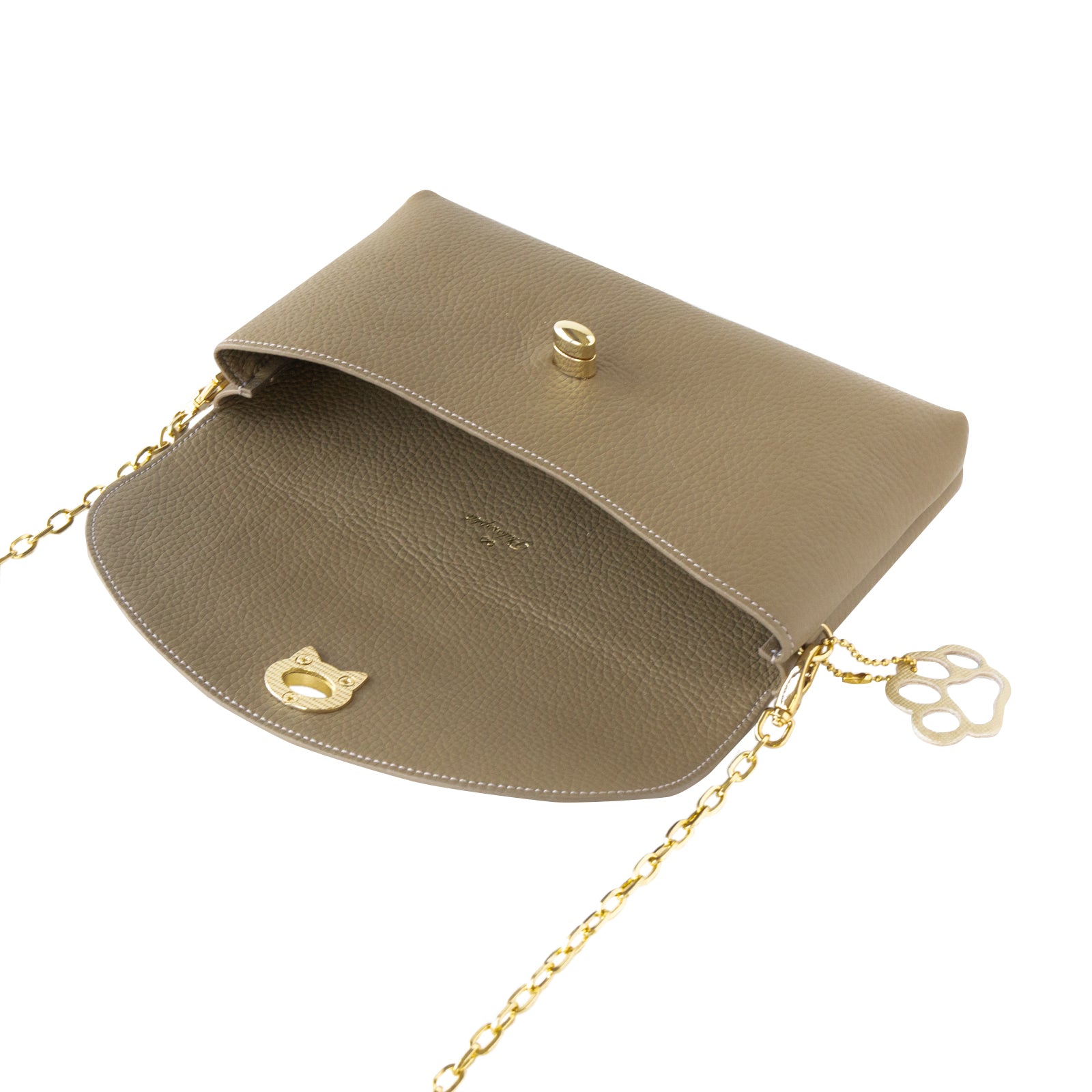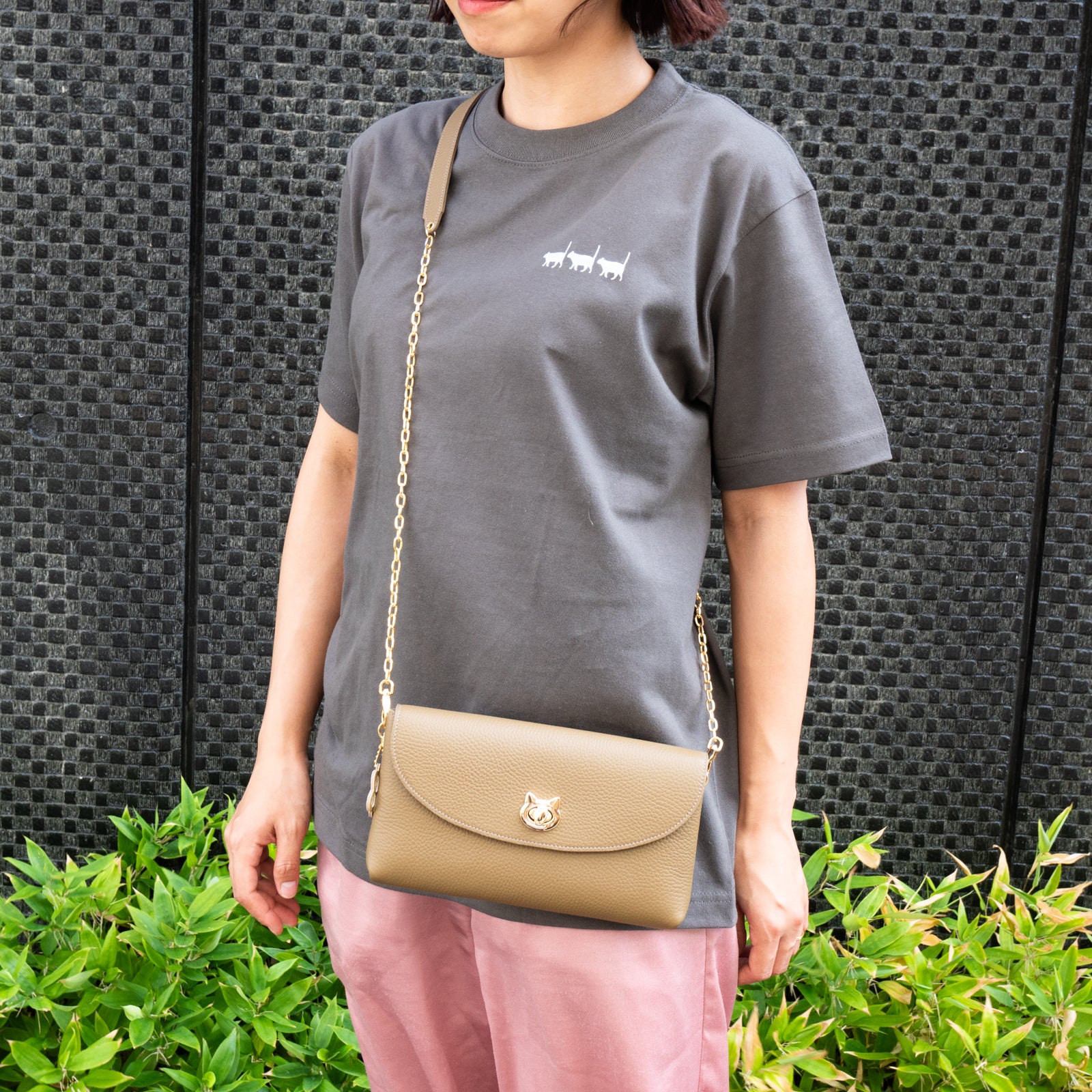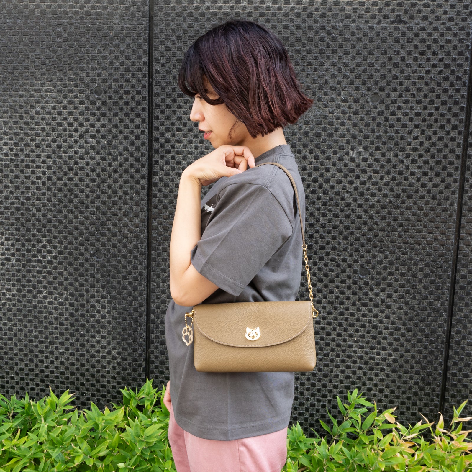 シンプルなフォルムにねこ金具と肉球チャームがマッチした、ねこ好きさんにぴったりのポシェットです。
