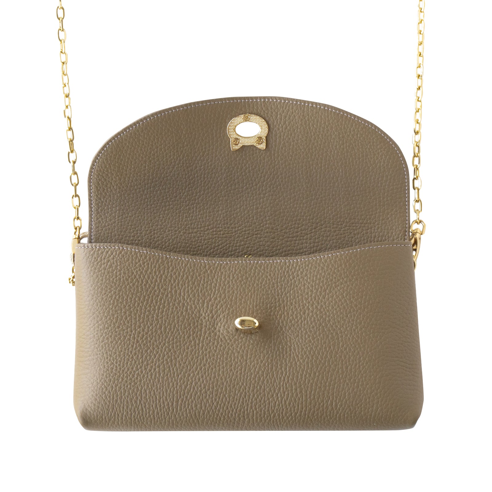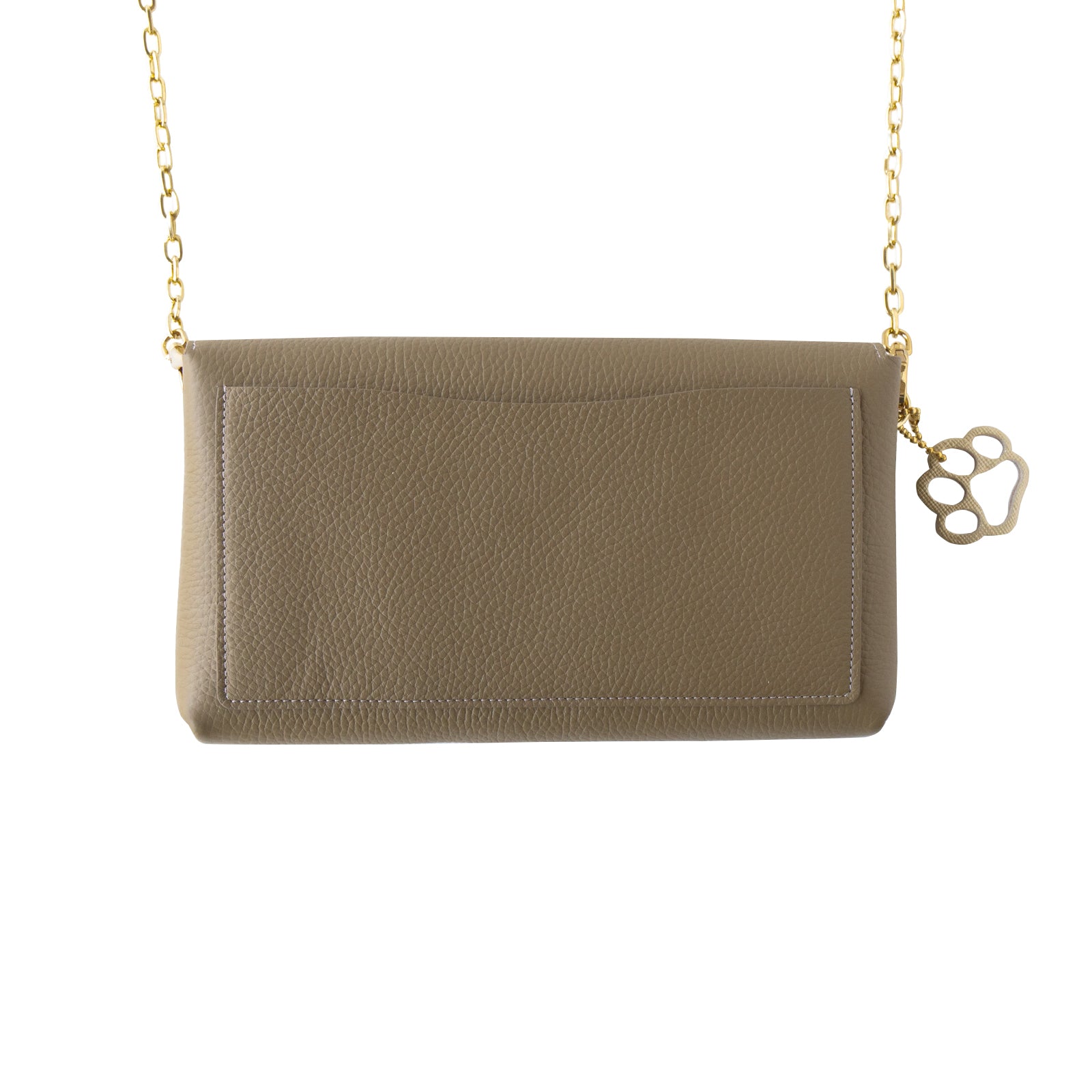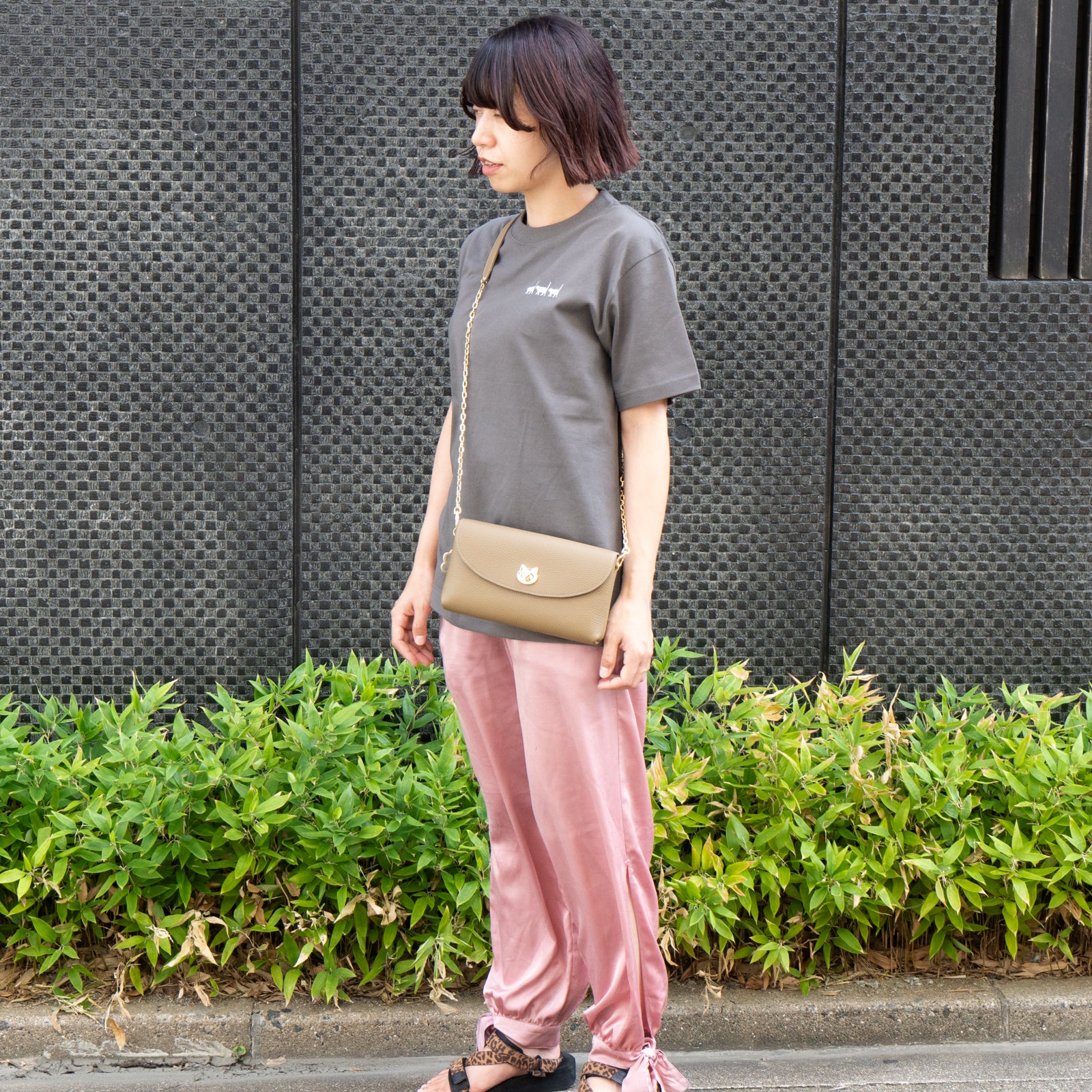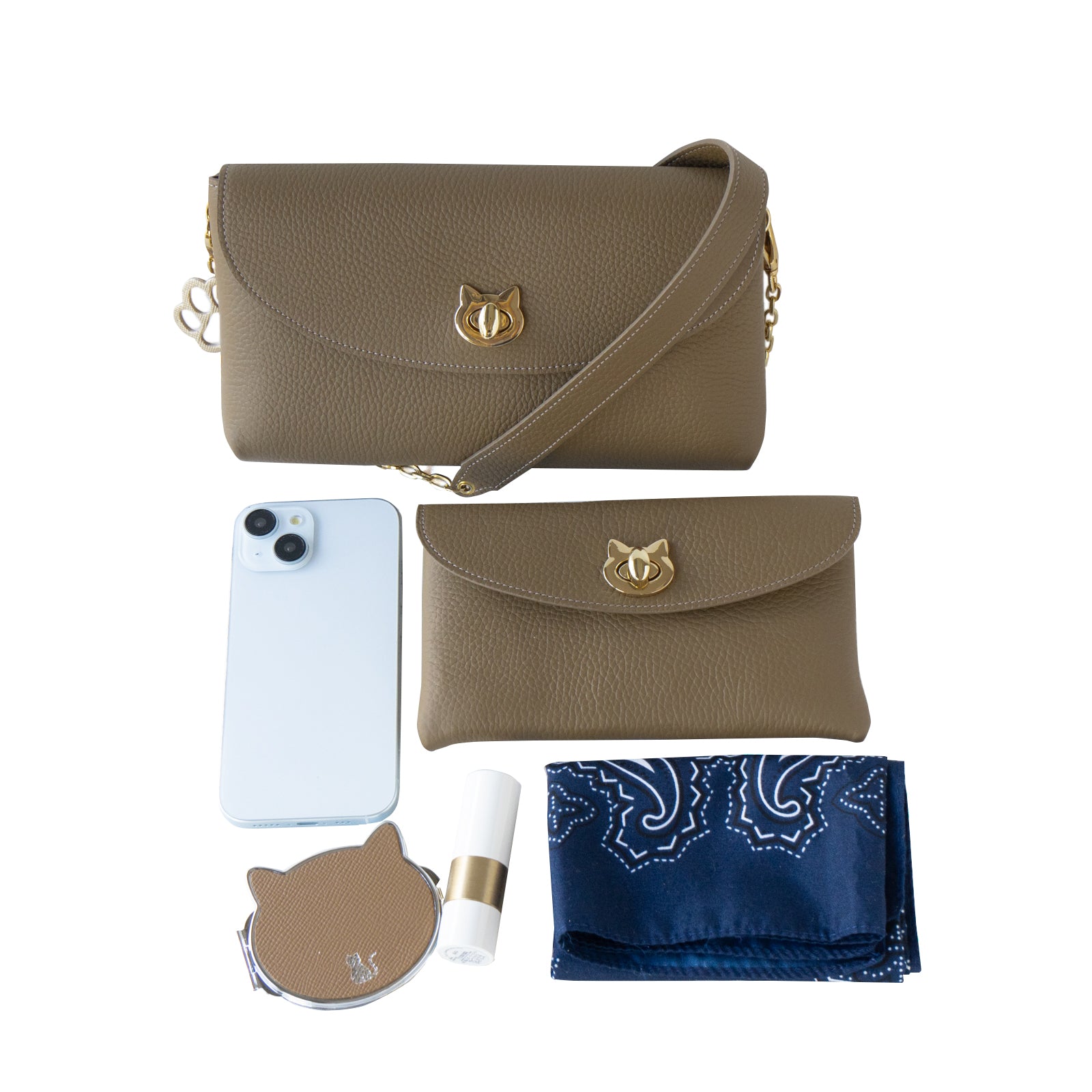 シンプルなフォルムにねこ金具と肉球チャームがマッチした、ねこ好きさんにぴったりのポシェットです。