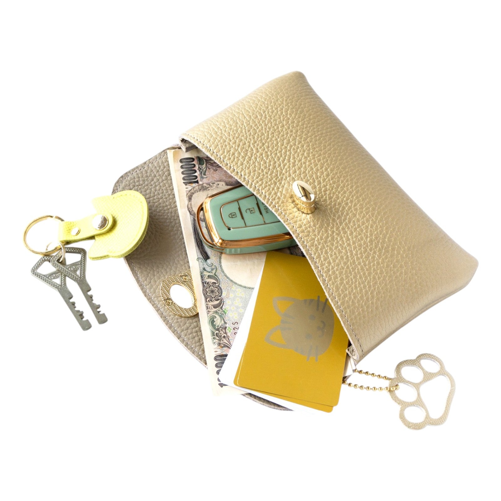 横幅はちょうど1万円札が折らずに入る大きさで、お金やカード、スマートキーなどが一緒に入り、車でのお出かけならこれ一つでさっと外出できます。