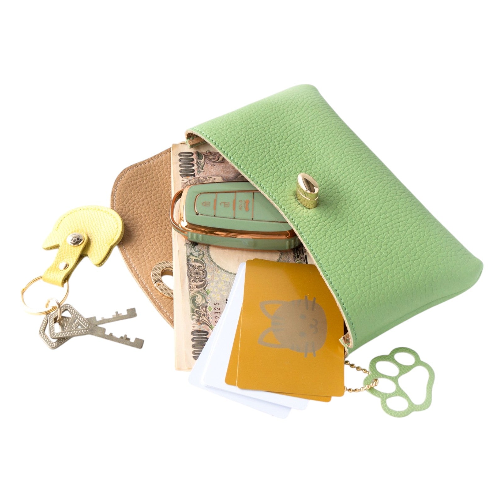 横幅はちょうど1万円札が折らずに入る大きさで、お金やカード、スマートキーなどが一緒に入り、車でのお出かけならこれ一つでさっと外出できます。