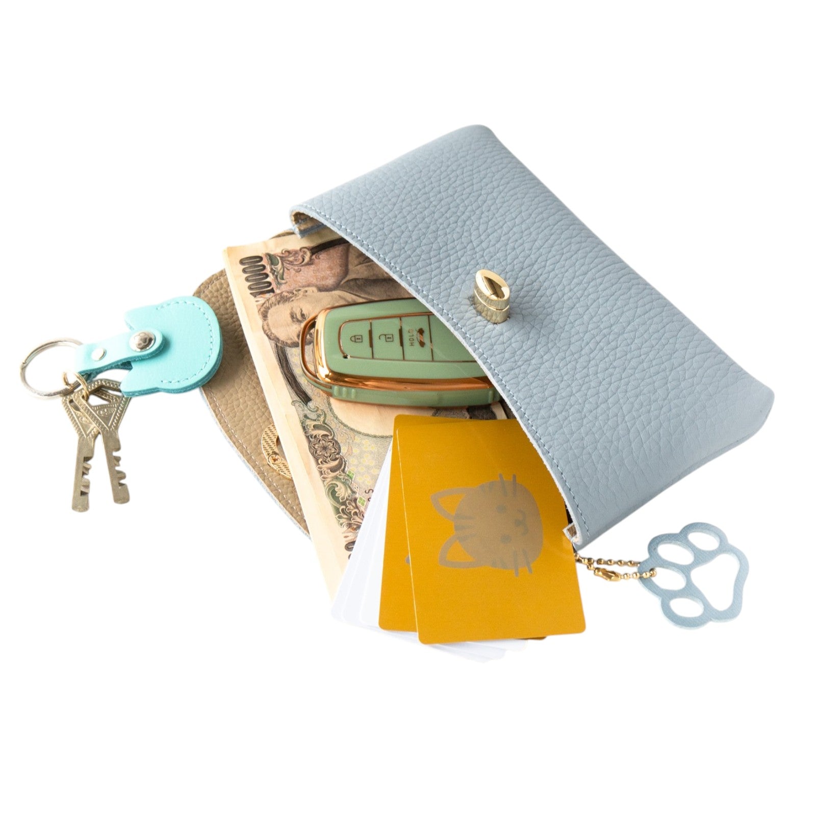 横幅はちょうど1万円札が折らずに入る大きさで、お金やカード、スマートキーなどが一緒に入り、車でのお出かけならこれ一つでさっと外出できます。