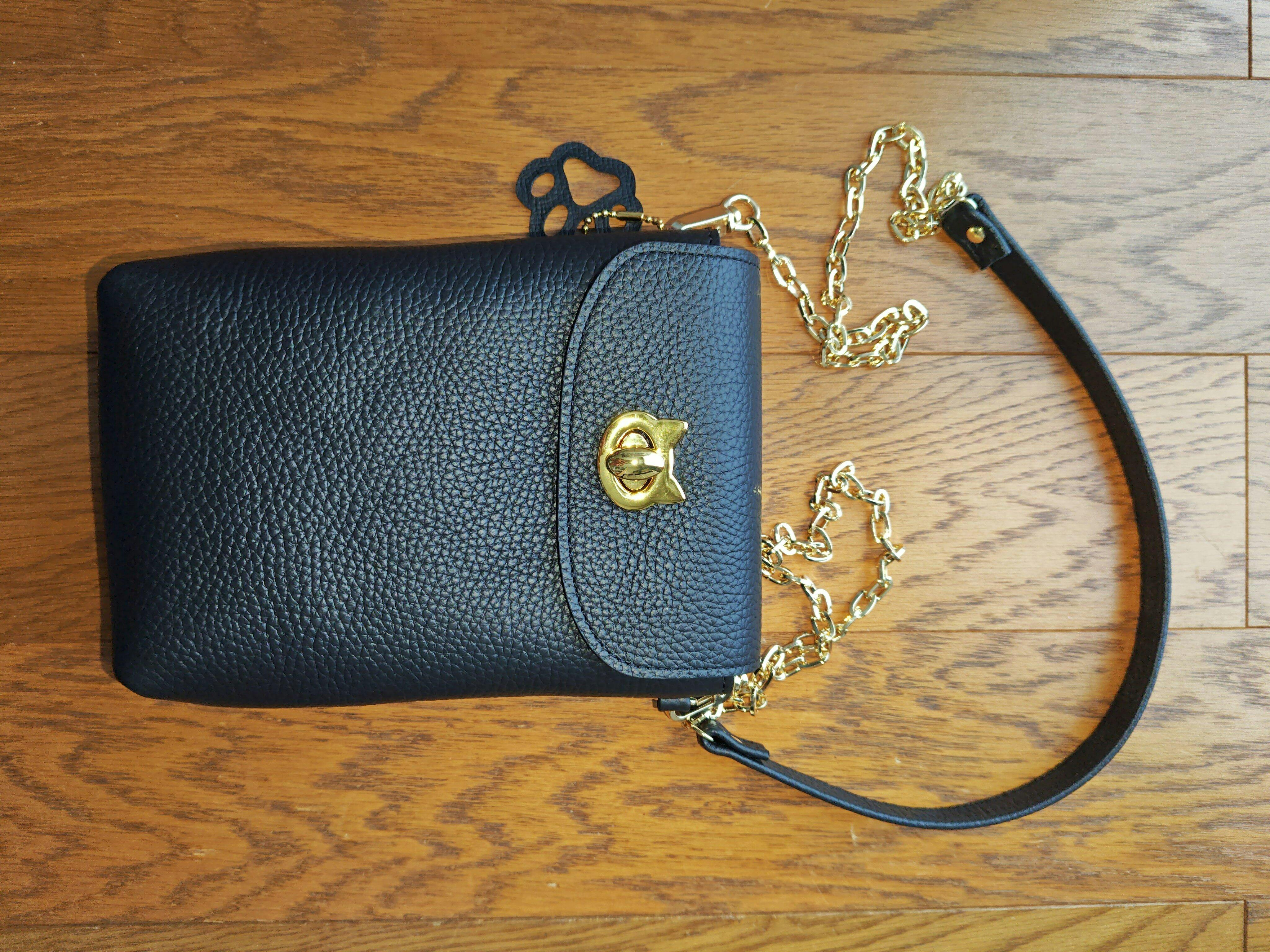 シンプルなフラップデザインにねこ金具が印象的なスマホポシェット。