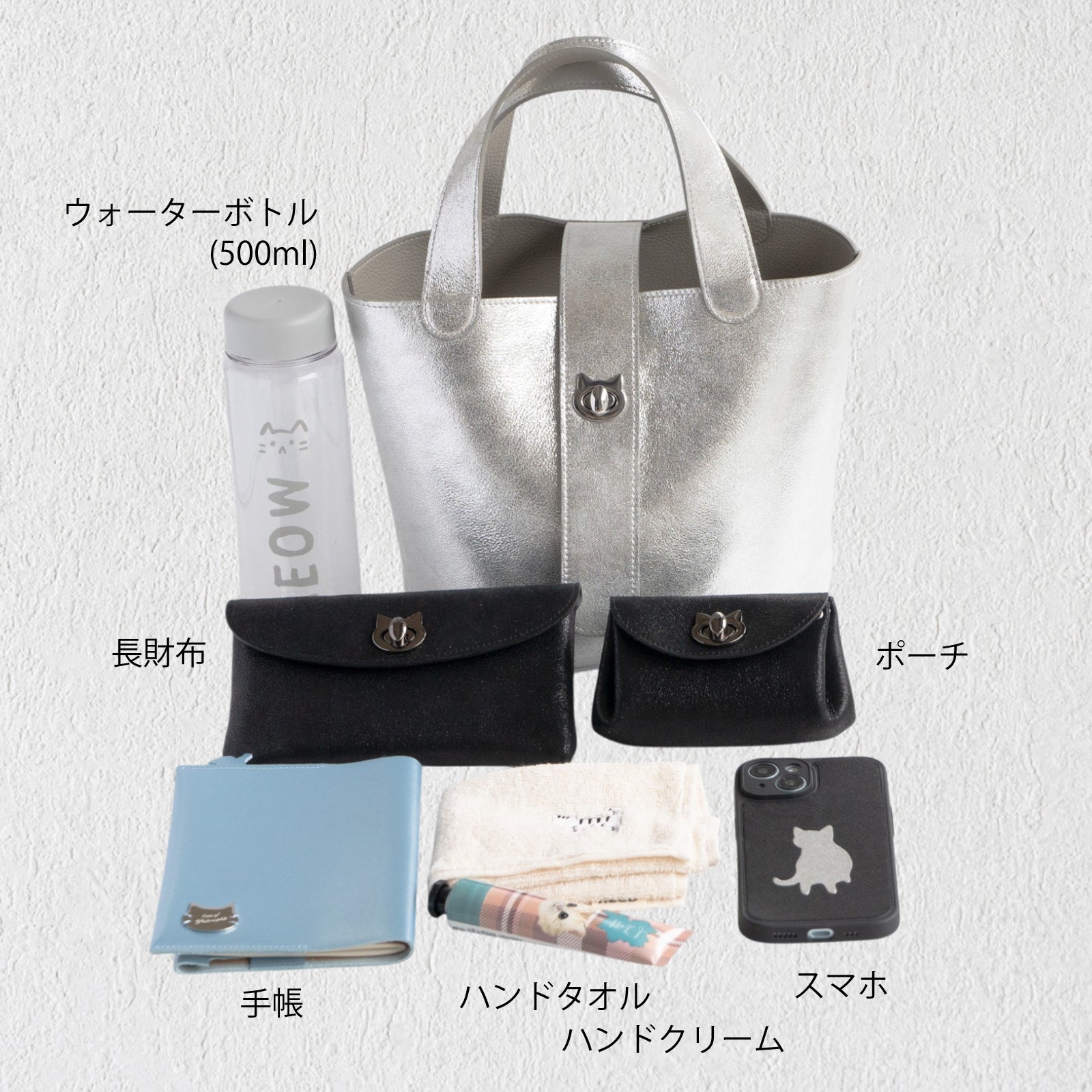 底に最大のねこポイントが隠された、シンプルなバケツ型ハンドバッグ。