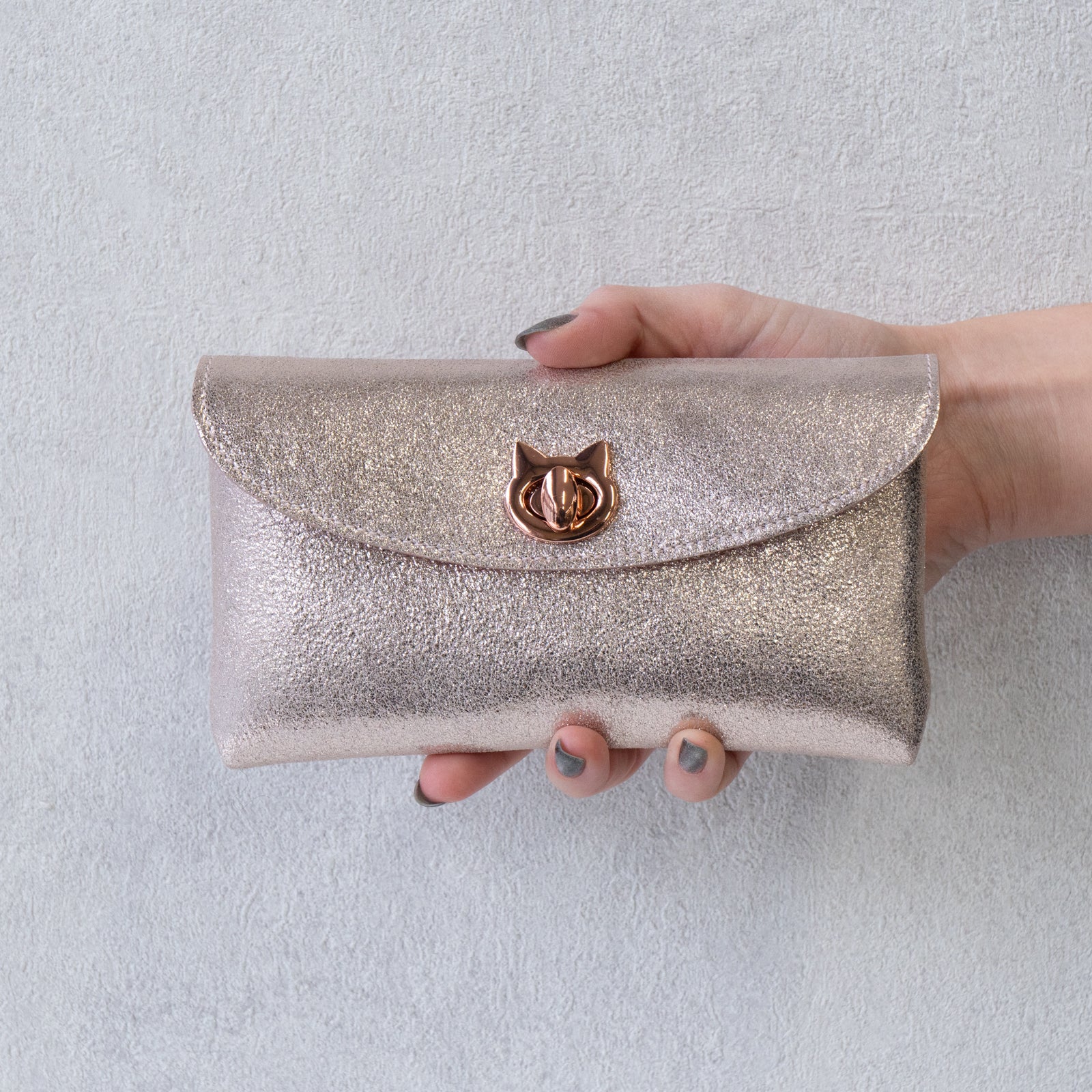 ラウンドしたフラップにねこの顔型金具が光ります。