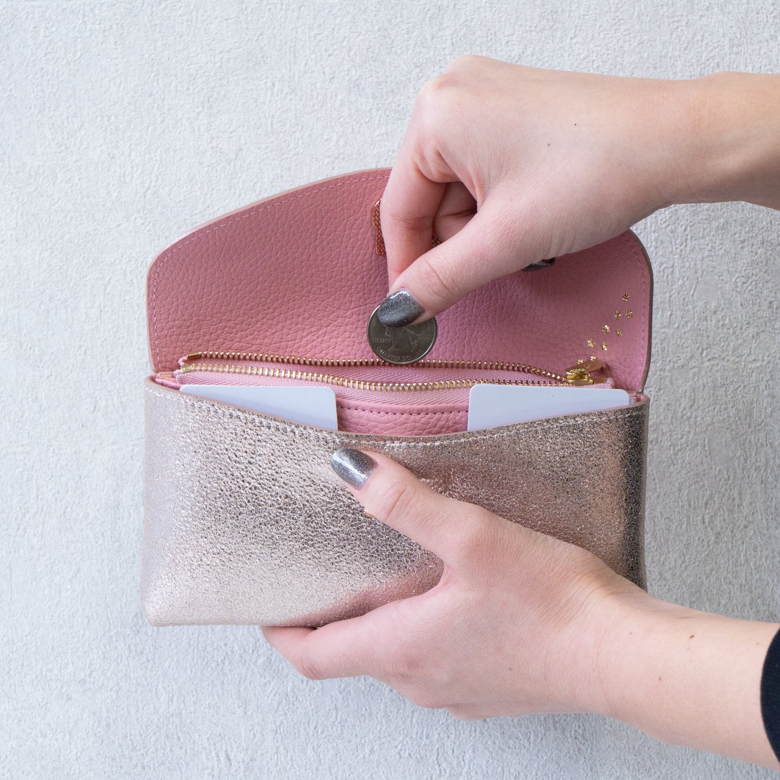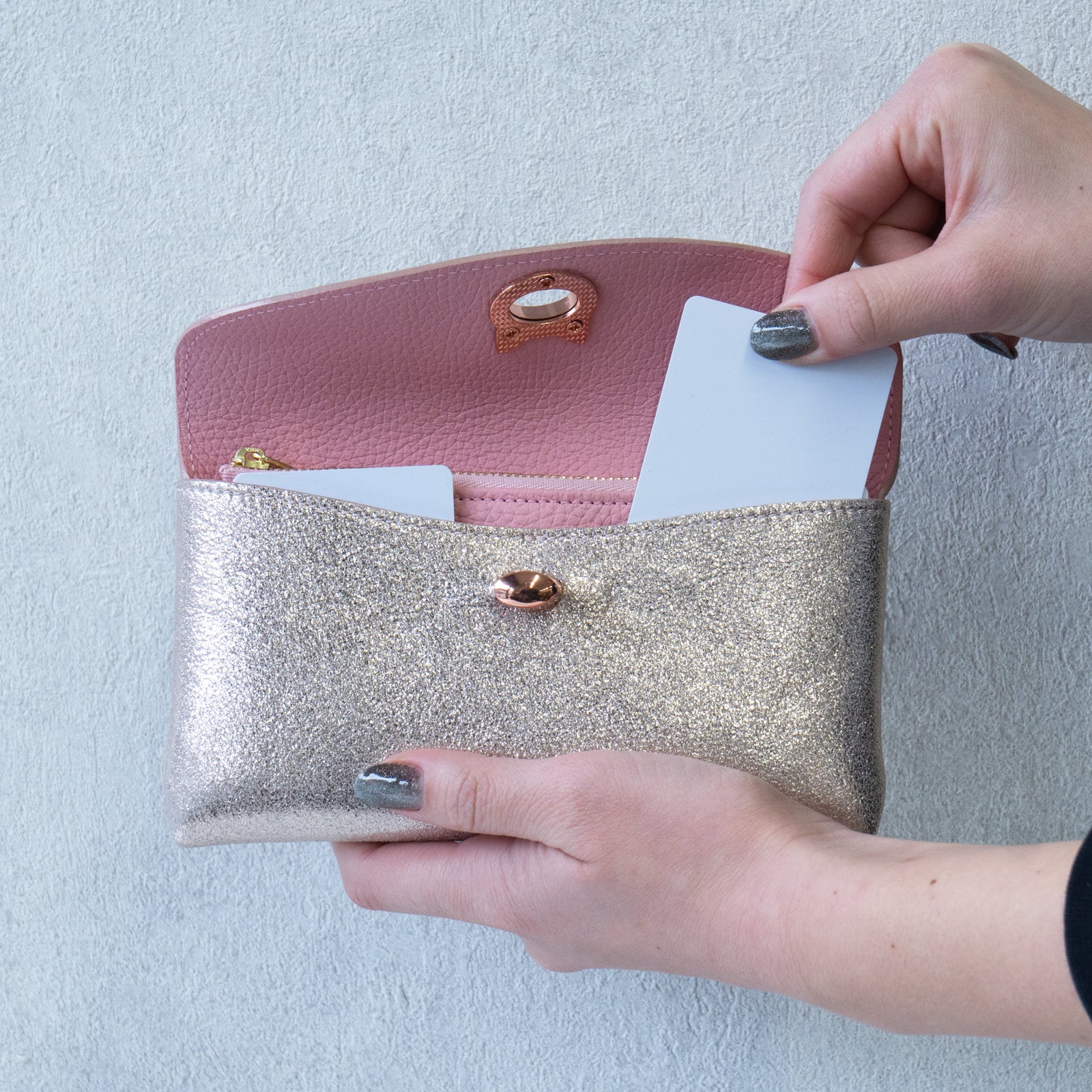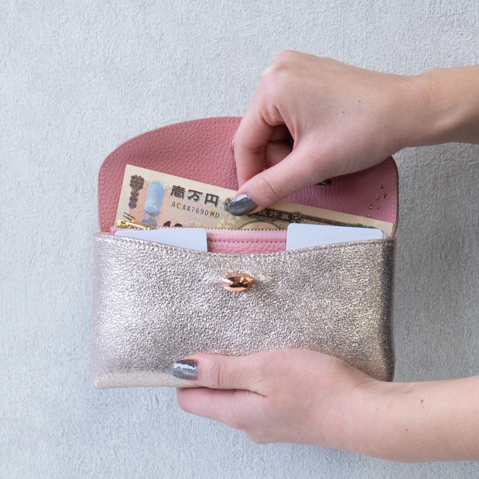 こちらのポーチに使用しているのは、羊革にラメ加工を施したレザーです。