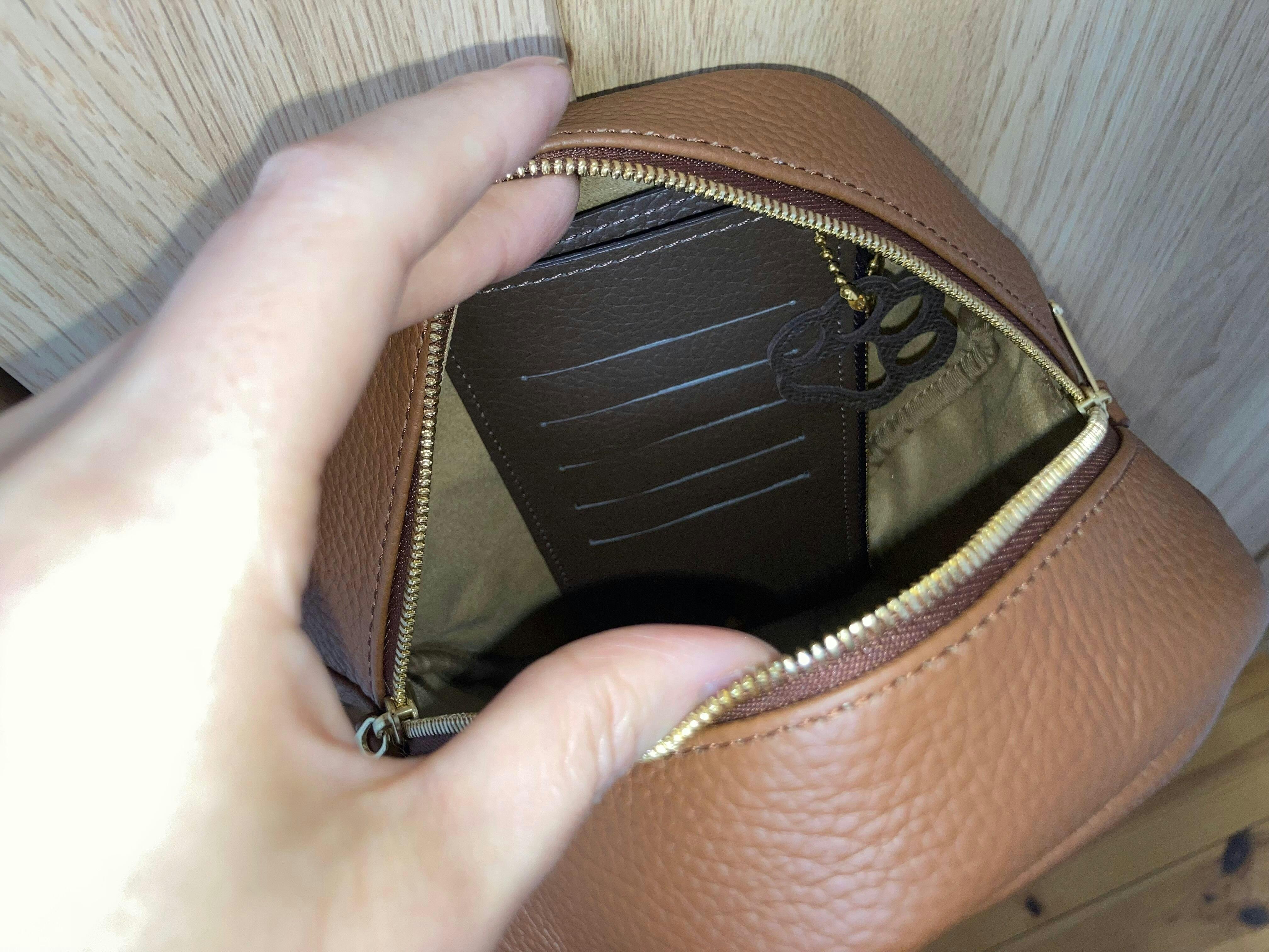 ころんとしたフォルムで、バッグ上部をファスナー開閉するデザイン。