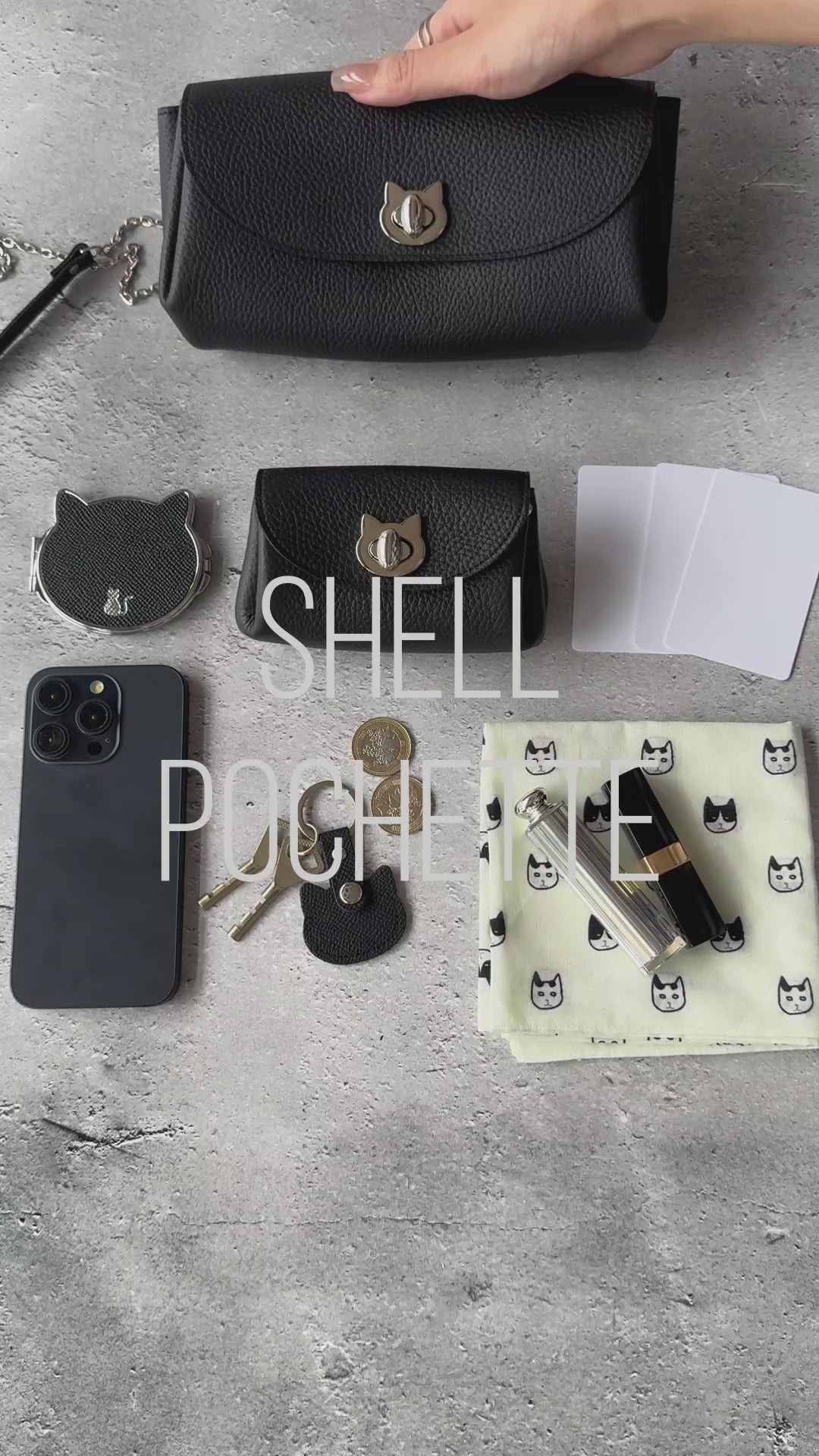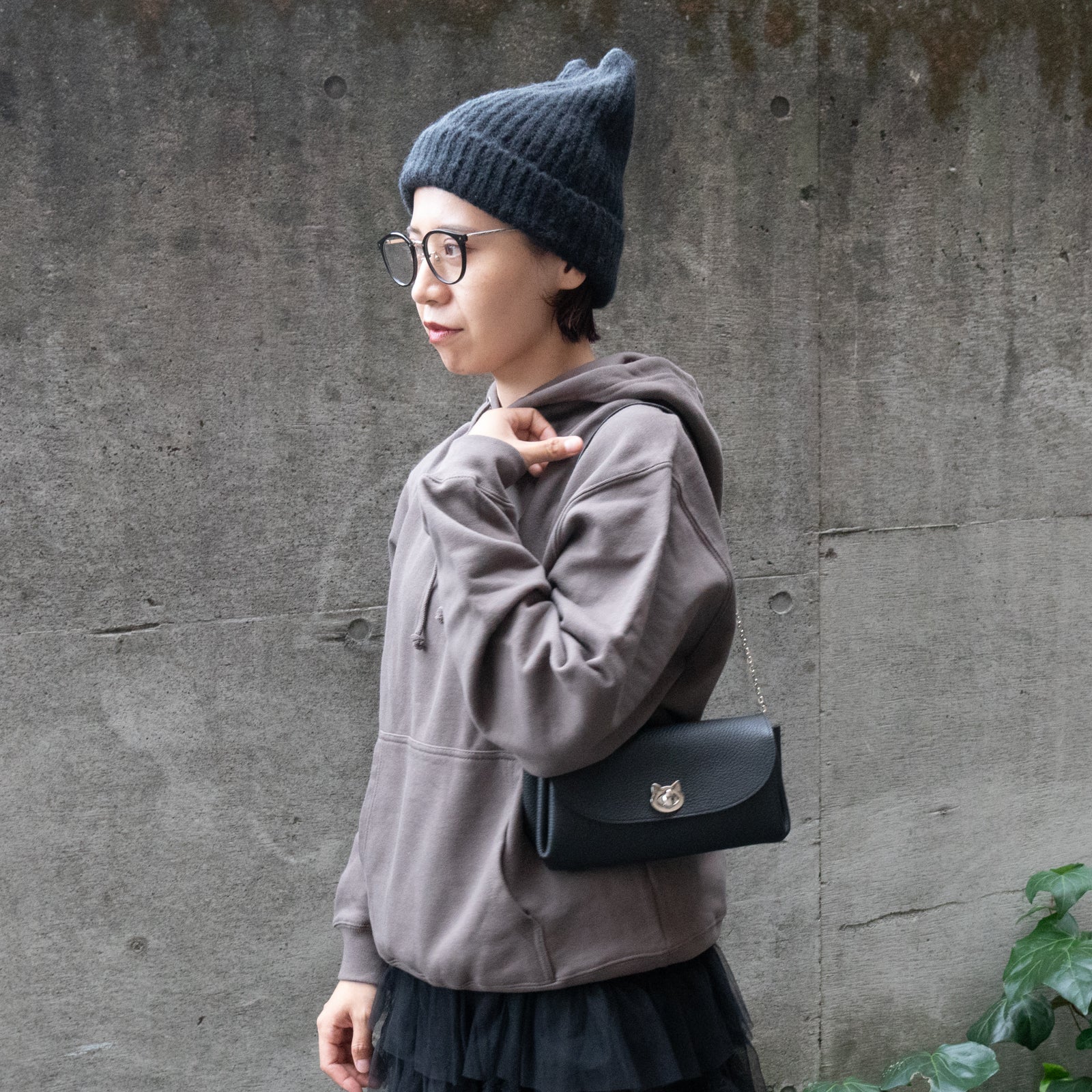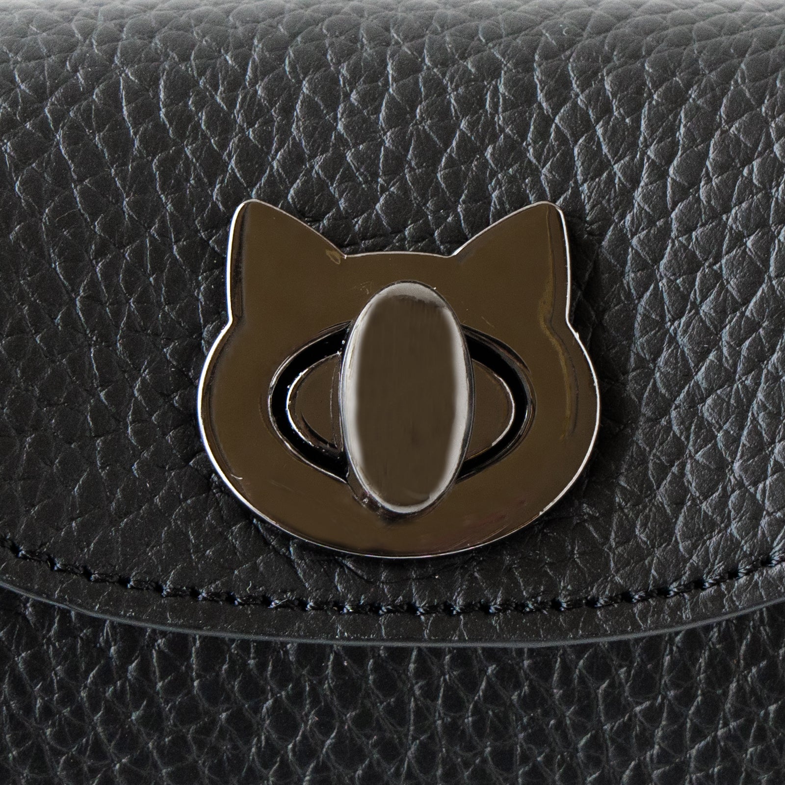 ころんとしたフォルムとねこ型の留め具がかわいいポシェットです。