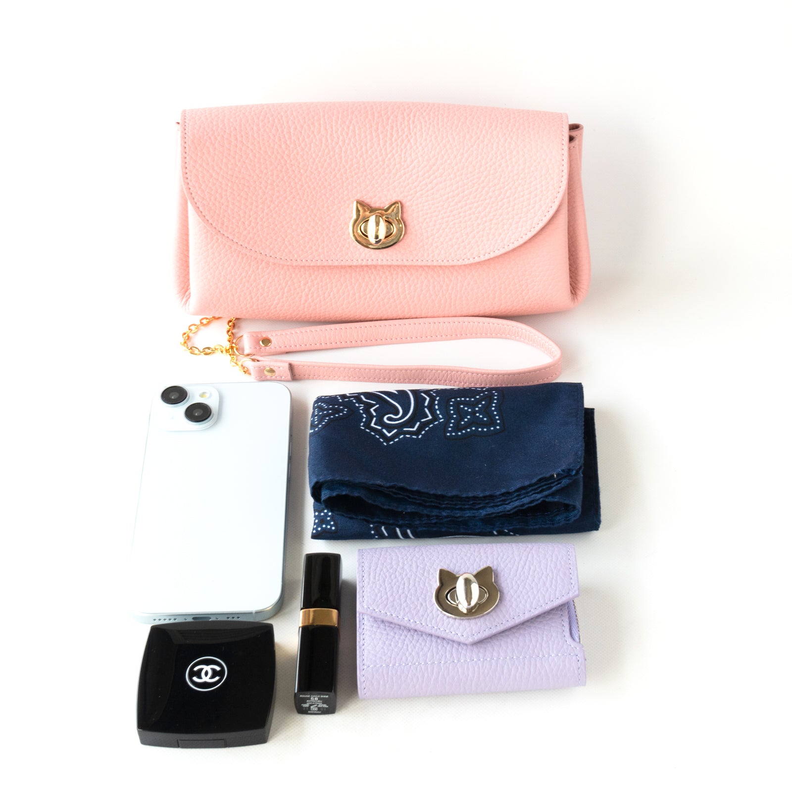 綺麗なカラーとワンポイントのねこ金具が気分を上げてくれるポシェットです。
