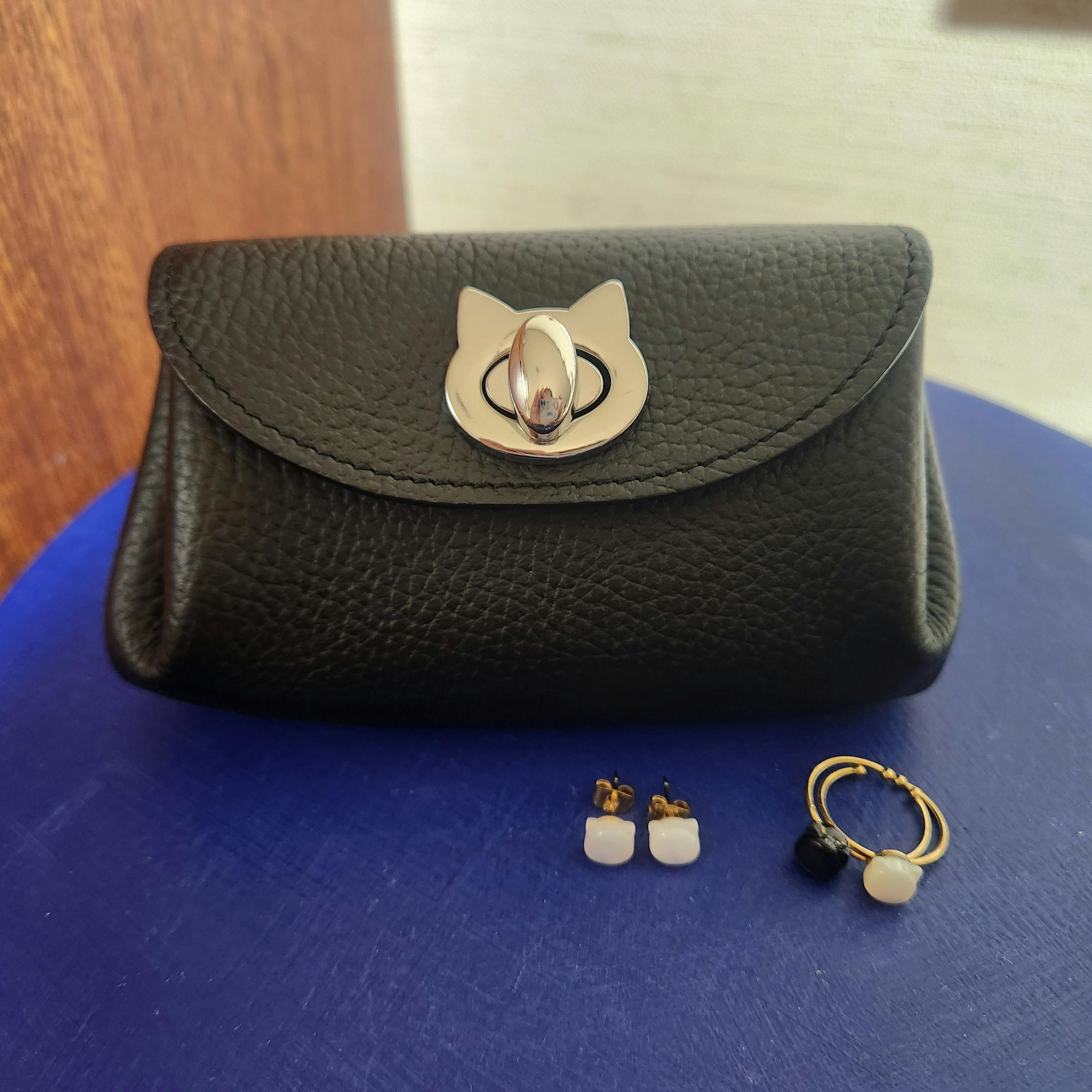 ころんとしたフォルムとねこ型の留め具がかわいいフラップポーチ。
